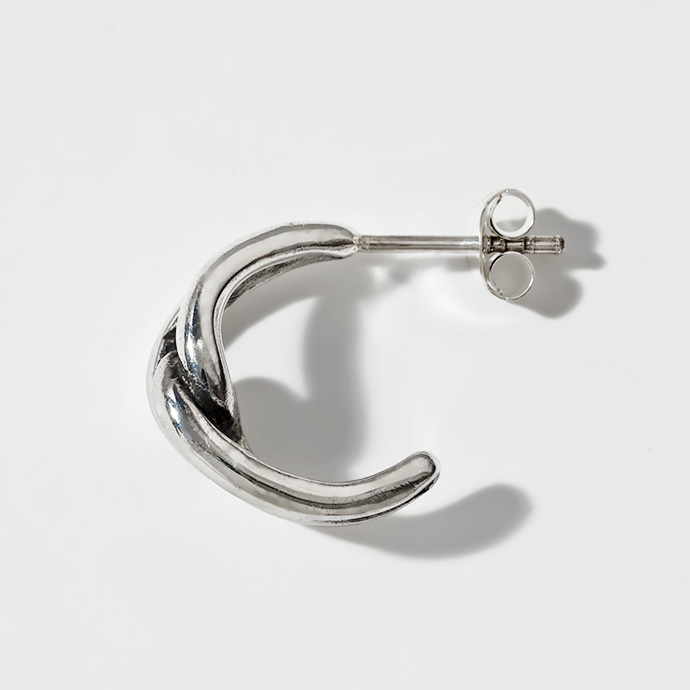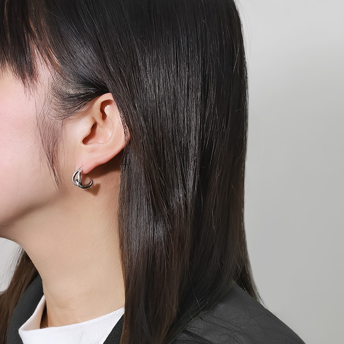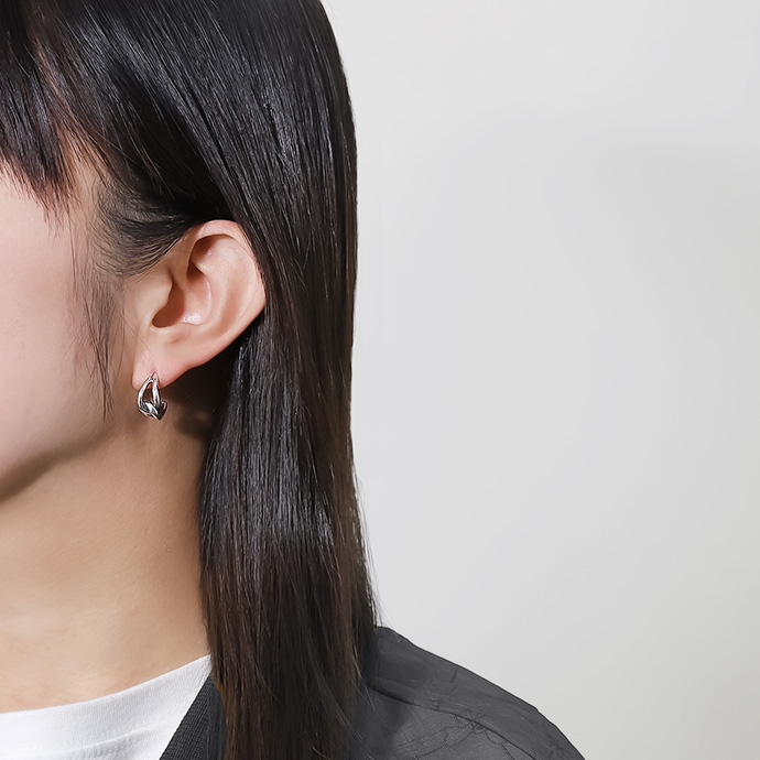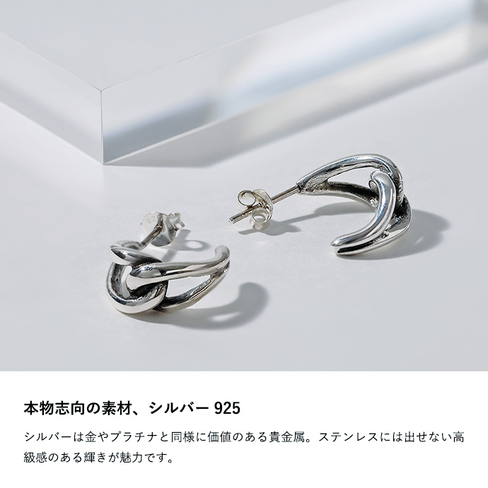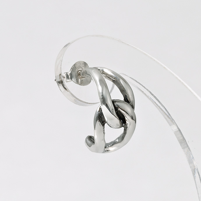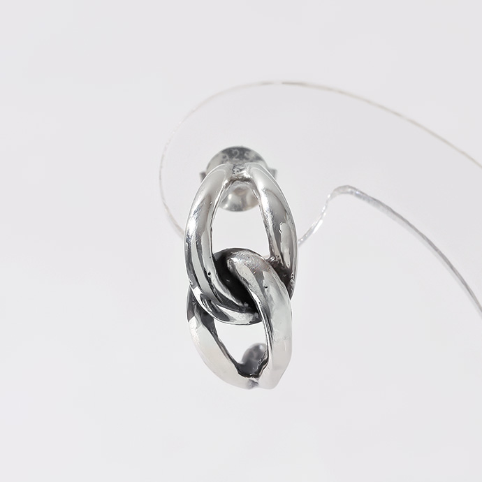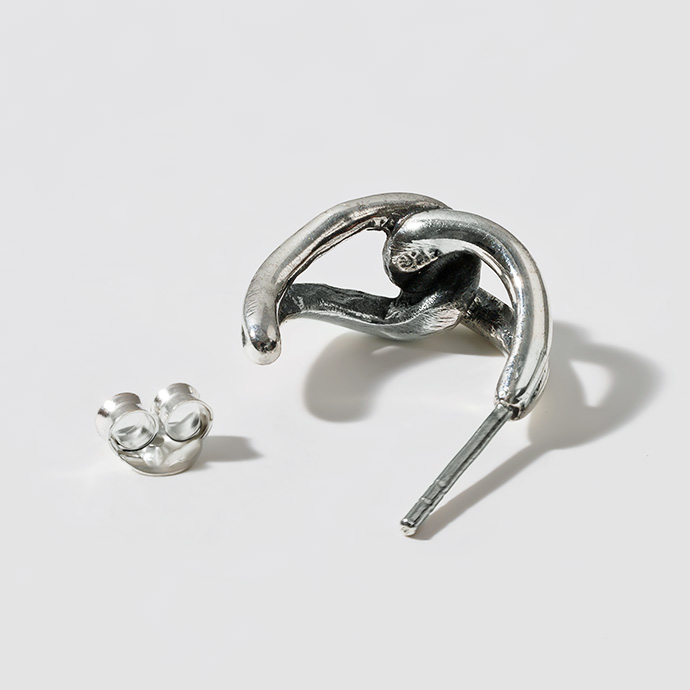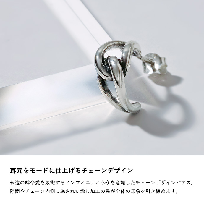 チェーンデザインにインフィニティ(∞)を思わせる流れるフォルムを取り入れたシルバー925ピアス。内側に施された燻し加工の陰影が立体感を生み、耳元を引き締めモードな印象に仕上げます。動きのあるデザインだから横顔にさりげないアクセントが加わり、シンプルな装いにも自然と馴染みます。程よい存在感でユニセックスに使いやすい、日常に取り入れやすいスタッドピアスです。