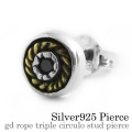 | 説明 | 様々な手法の円が三重になった、一風変わったデザインのスタッドピアス。中でもロープをぐるっと一周した風な円は真鍮を用いゴールド仕上げに!三重層の中央にはブラックジルコニアをセットし、小さなボディの中にも細かい細工が何重にも施された、目を引く逸品です。 | |