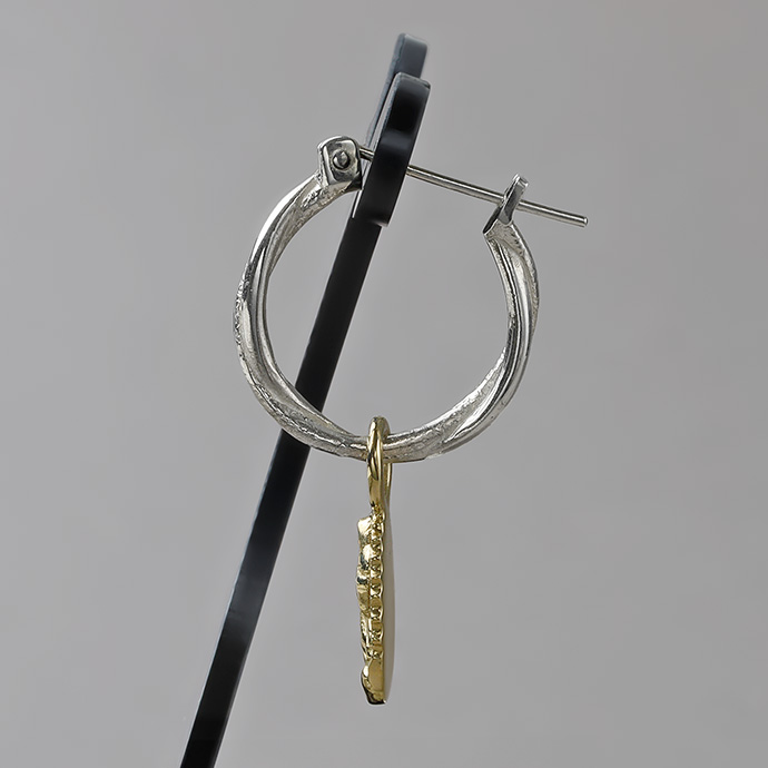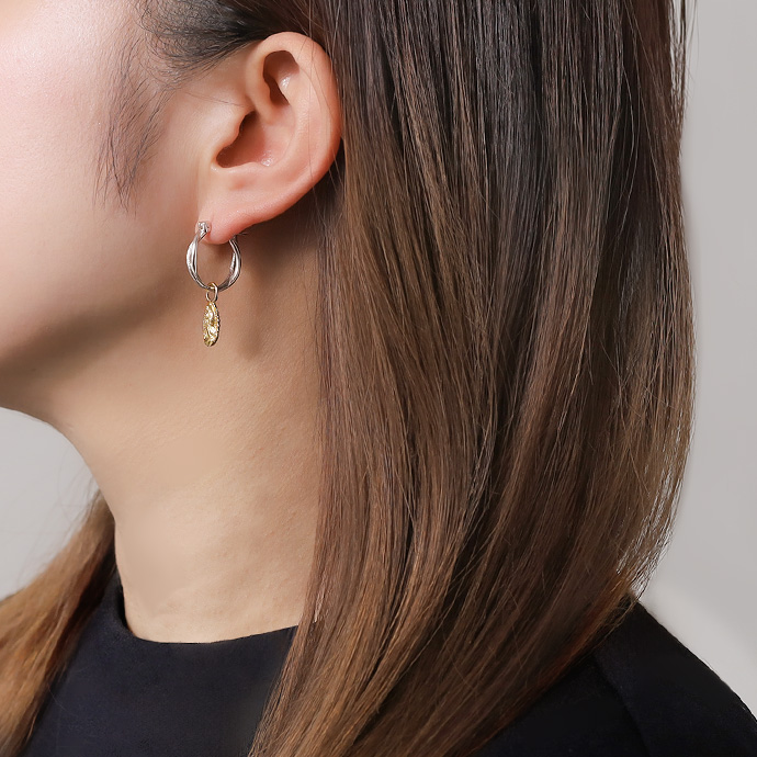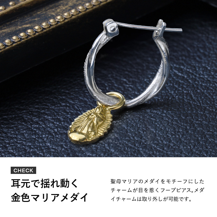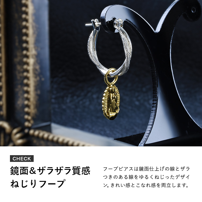 揺れ動くマリアメダイチャームが付いたフープピアス。シルバー925製のフープピアスは鏡面仕上げの線とザラつきのある線をゆるくねじったデザインで、きれいめになりすぎずこなれ感を演出。チャームを外すことで普通のフープピアスとしてもご使用いただけます。ビジュアル系やゴシック系の黒コーデに合わせたくなるデザインのアイテムです。 シルバー925は上品かつ高級感のある輝きが特徴。適切なお手入れで輝きを保つことも自分色に育てることもできる、永くご愛用頂ける貴金属です。 シルバー925は上品かつ高級感のある輝きが特徴。適切なお手入れで輝きを保つことも自分色に育てることもできる、永くご愛用頂ける貴金属です。 | |