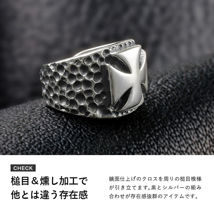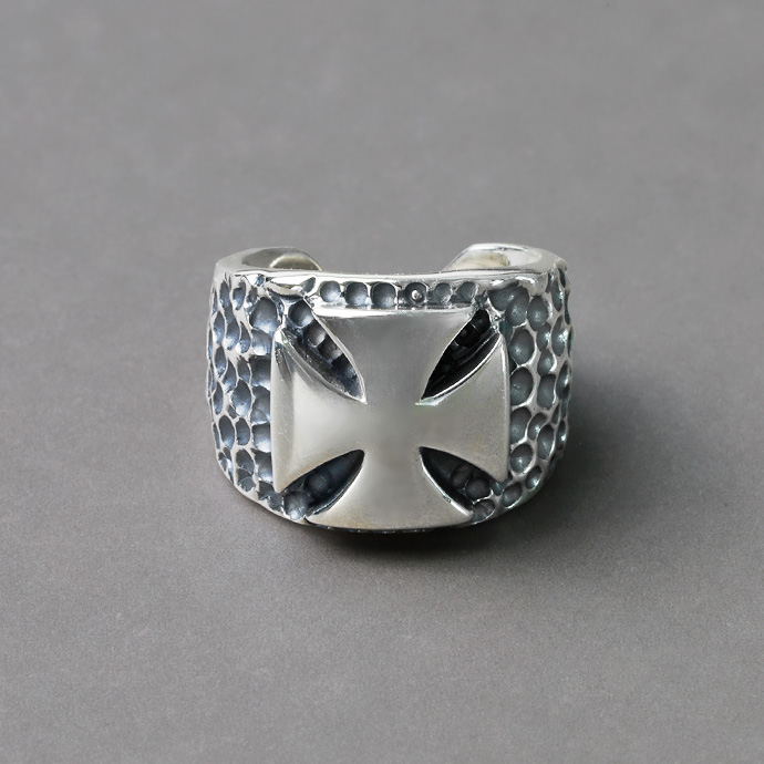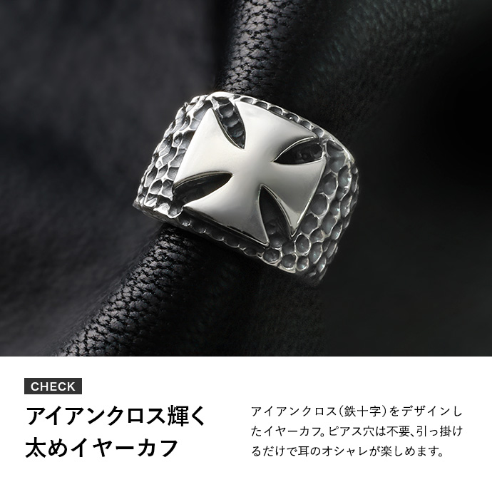 中央にアイアンクロス(鉄十字)をデザインしたイヤーカフ。 鏡面仕上げのクロスを周囲の槌目模様が引き立てます。燻しの黒とシルバーの組み合わせが存在感抜群、耳元に力強さをプラスできるアイテムです。イヤーカフはピアス穴が無くても引っ掛けるだけで着けられる耳アクセサリー。一番視線が集まる顔周りに簡単にアクセントをプラスできるのが魅力です。