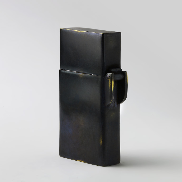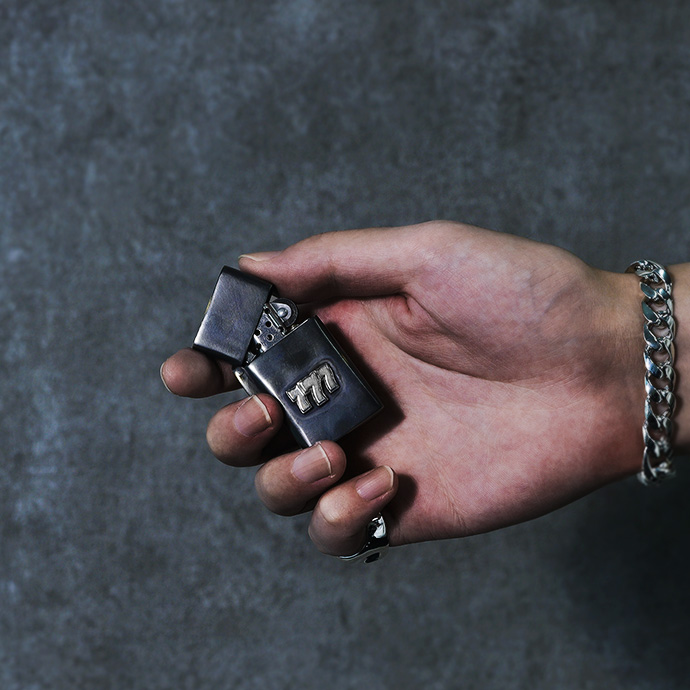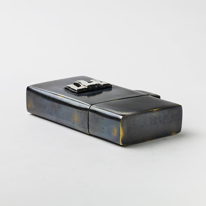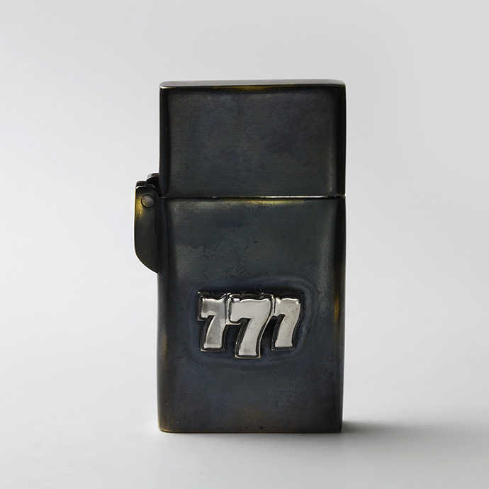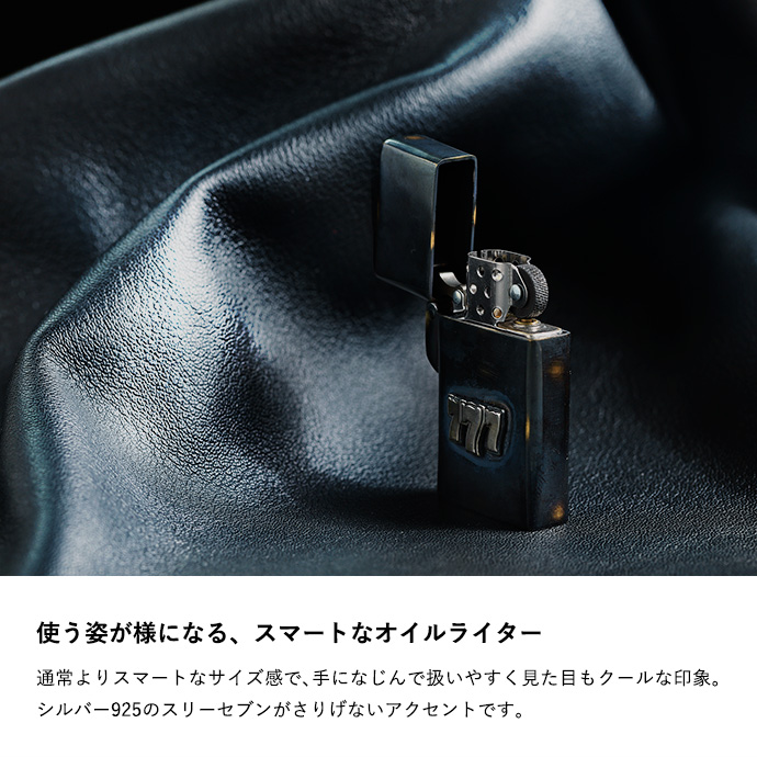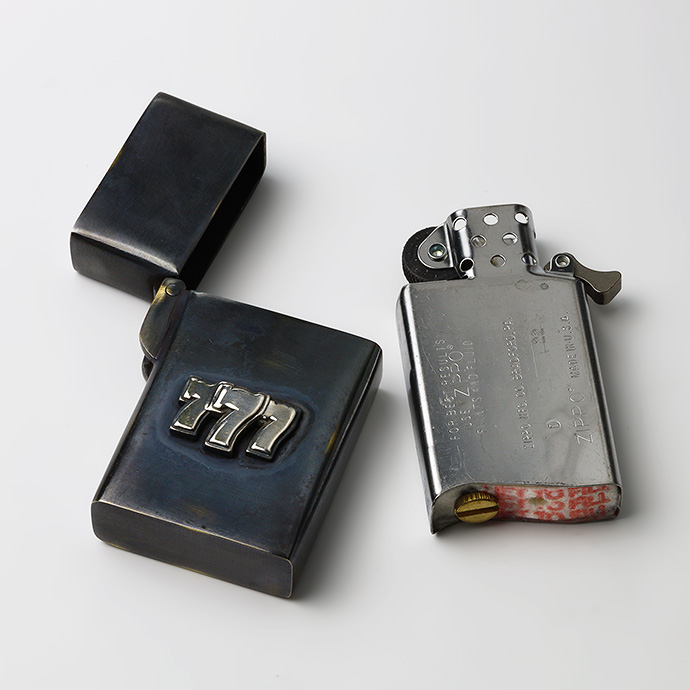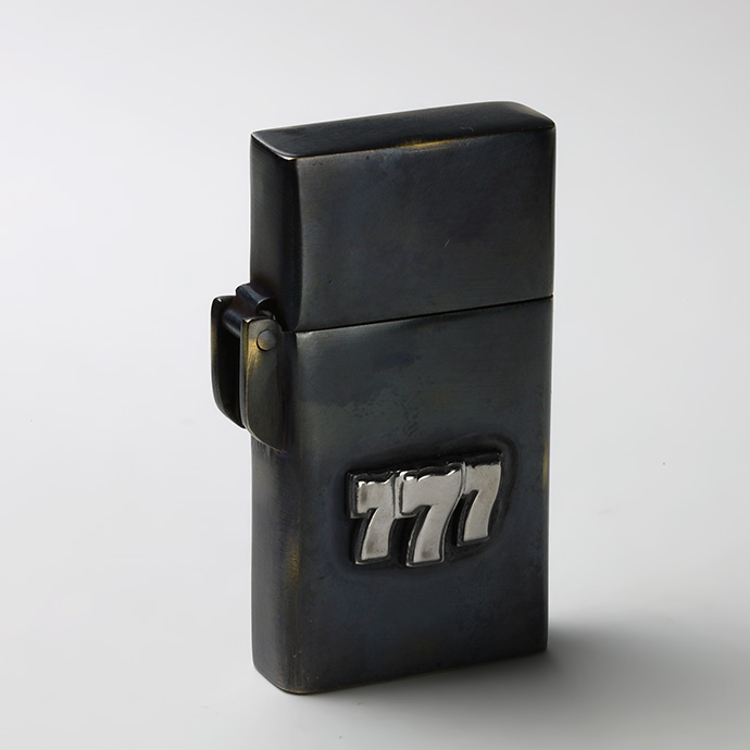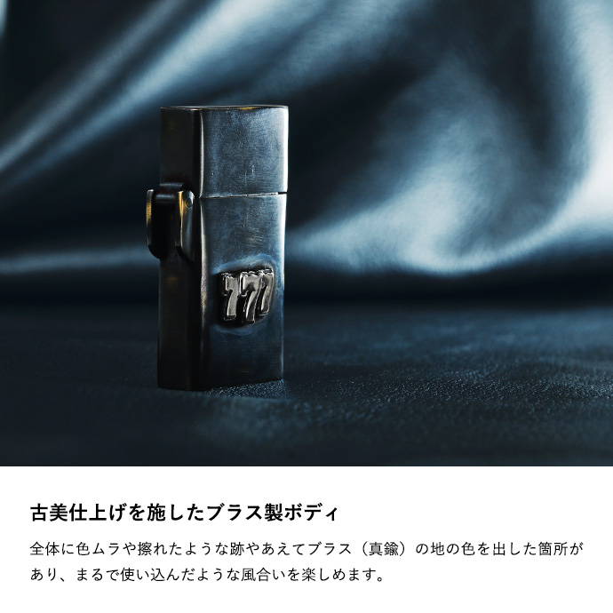 外装に古美仕上げを施したオイルライター。シルバー925製のスリーセブンがアクセントになっています。通常よりスマートなサイズ感で、手になじんで扱いやすく、見ためも野暮ったくなくクールな印象。全体に色ムラや擦れたような跡、あえて真鍮の地の色を出している箇所などがあり、まるで使い込んだような風合いを楽しめます。深みのあるボディにシルバーの777が目を引く、使う姿まで様になるアイテムです。