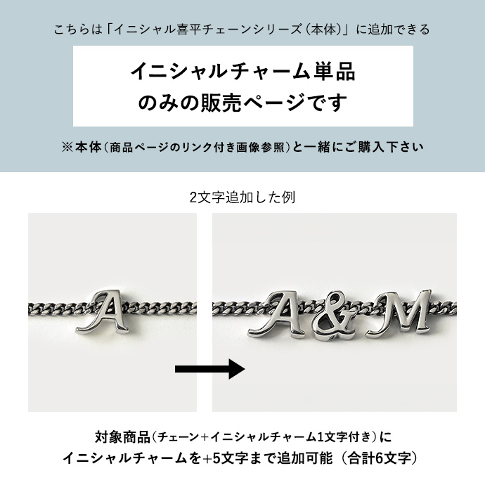こちらは「イニシャル喜平チェーンシリーズ」に追加できる、イニシャルチャーム単品の販売ページです。対象商品(チェーン+イニシャルチャーム1文字付き)に、イニシャルチャームを5文字まで追加可能です(合計6文字)。