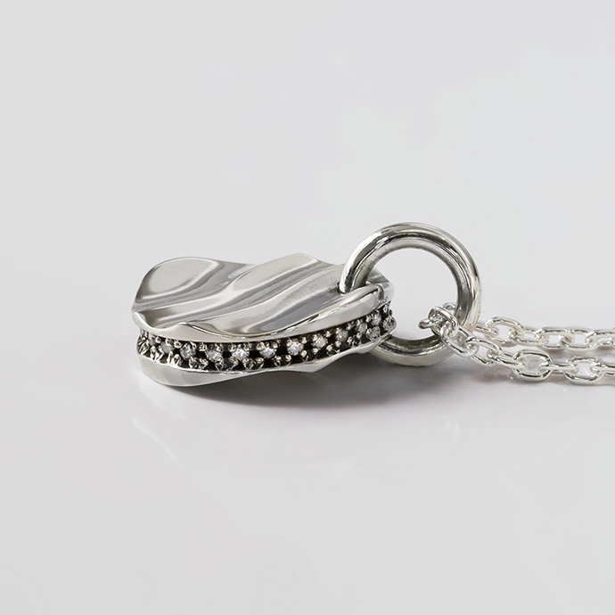 表面に波を思わせる斜めのデザインが入ったペンダント。側面の燻し加工の黒色とクリアジルコニアのコントラストがスタイリッシュかつラグジュアリーな輝きを演出し、いつもと違うあなたを演出します。波模様の輝きや側面からチラリと見えるジルコニアなど、種類の違う輝きが様々な角度から楽しめる完成度の高いデザインです。大切な方への贈り物としてもオススメのペンダントです。