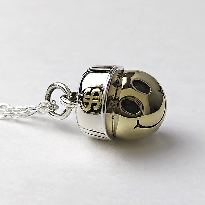 | 説明 | ドルマークが付いたキャップをななめにかぶったスマイルのペンダント。正面から見ても斜め下を向く姿が斜に構えたように見えて愛嬌を感じるデザインです。ストリートファッションのスマイルに合わせてビックシルエットのTシャツとコーデしたくなるアイテムです。 | |