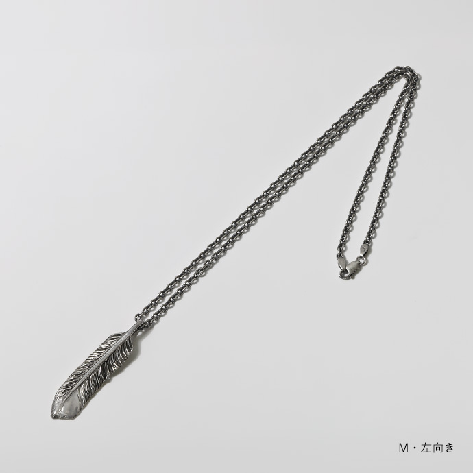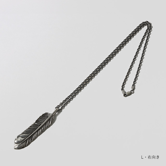 緻密な彫金が目を惹くイーグルフェザー(鷲の羽根)のペンダント。燻し加工の黒色が素材本来の重厚感を引き立たせ、無骨さとヴィンテージ感を演出。輝きすぎないのでアメカジコーデなど普段のコーデにカジュアルに取り入れやすいのが魅力です。3種類のサイズとフェザーの向き(右向き・左向き)がお選びいただけます。単品での着用はもちろん、他ペンダントと組み合わせてカスタムネックレスを作る楽しみ方も魅力の1つです。