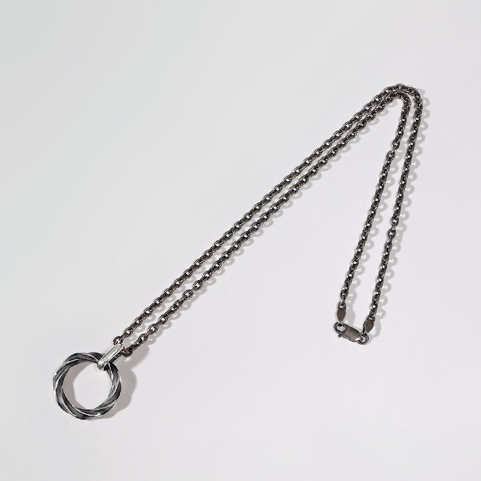 全体に施された燻し加工の深みのある陰影とねじれフォルムが静かな存在感を放つシルバー925製のリングペンダント。シンプルなデザインだからこそ幅広いコーディネートに馴染み、日常使いでも違和感なく取り入れていただけます。リング部分にツルが細めの眼鏡やサングラスを掛けてメガネホルダーとしても使用でき、サングラスを外した際の置き場に困らずスマートに携帯できる実用性も嬉しいポイント。大人の装いに自然と溶け込む、デザイン性と機能性を兼ね備えたグラスホルダー兼ネックレスです。