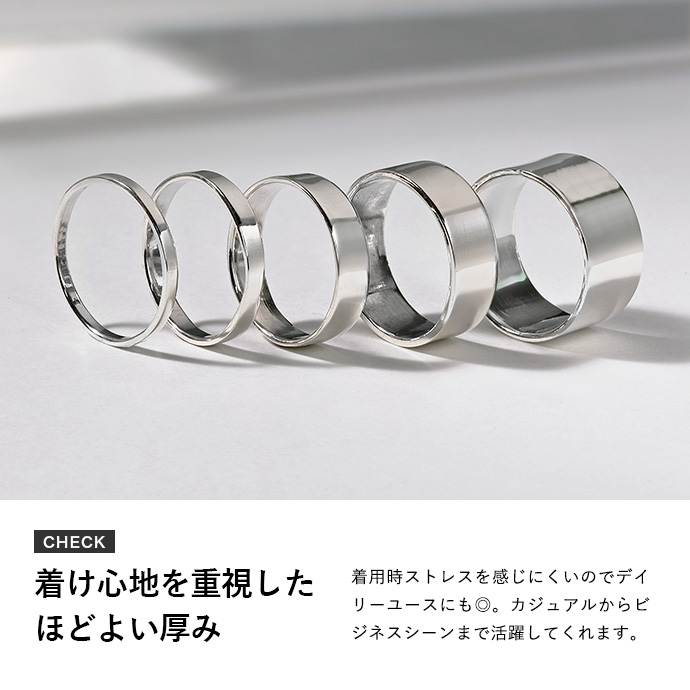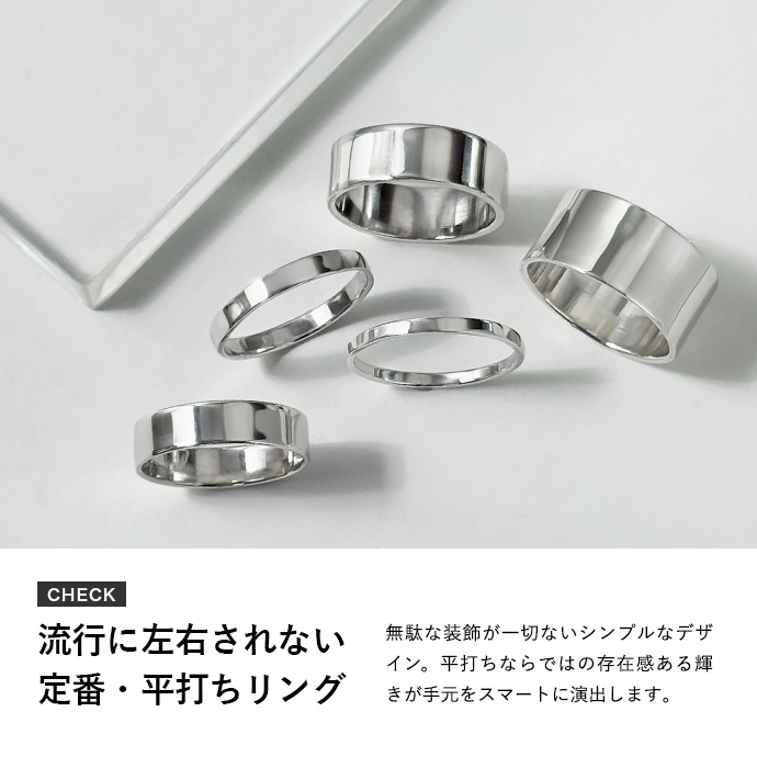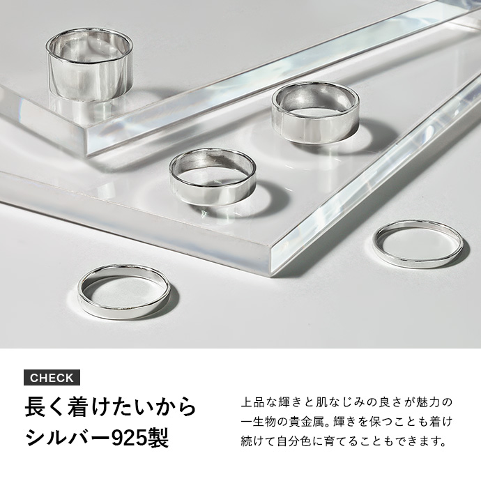 | 説明 | 無駄な装飾が一切ないシンプルな平打ちリング。平打ちリングの特徴である存在感ある輝きが手元をスマートに演出します。流行に左右されない普遍的なデザインで、1つは持っておきたいアイテムです。素材は上品な輝きと肌なじみの良さが魅力の一生物の貴金属・シルバー925。輝きを保つことも着け続けて自分色に育てることもできます。着け心地を重視した程よい厚みなので、着用時ストレスを感じにくくデイリーユースにも◎。カジュアルからビジネスシーンまでどんなファッションにも取り入れやすいデザインなので、大切な方への贈り物としてもオススメです。 | |