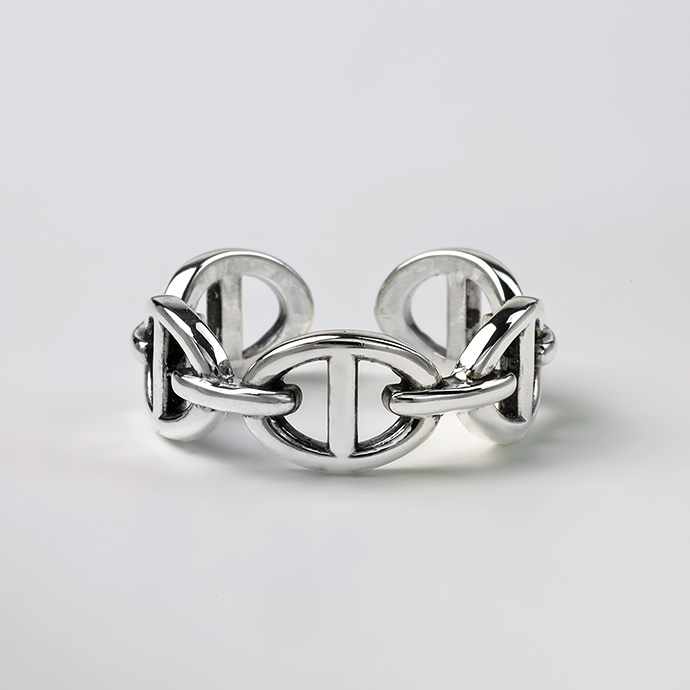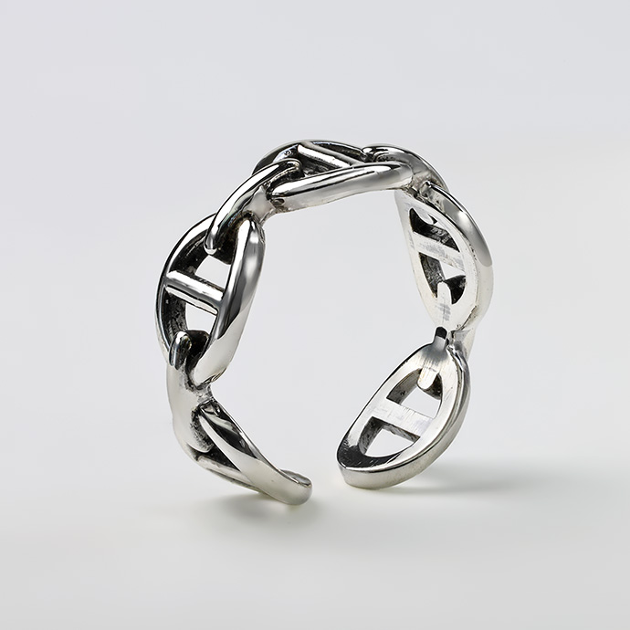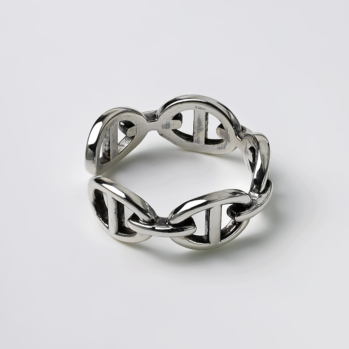 シンプルかつデザイン性の高さが人気のアンカーチェーンデザインのリング。よく出回っている細めで華奢な物とは異なり、しっかりと幅や厚みを持たせた男性の指にこそ似合うサイズにデザインしています。素材は本物志向の素材・シルバー925。他の金属には出せない輝きと重厚感が魅力で、素材までこだわりたい方におすすめです。細め幅タイプと合わせてペアリングとして贈りたい、男性にも女性にも人気のあるジェンダーレスデザイン。アンカーチェーンブレスレットとも相性抜群で、コーデの印象を格上げしてくれます。