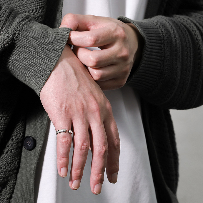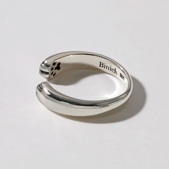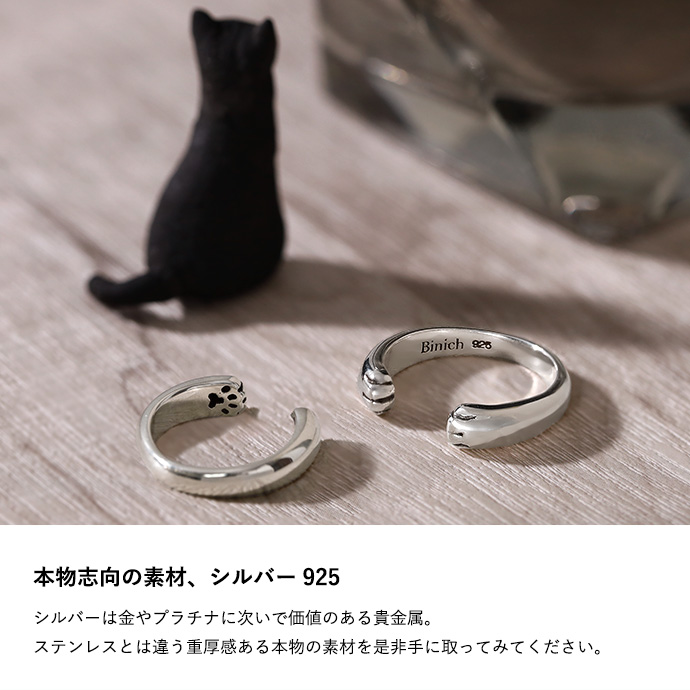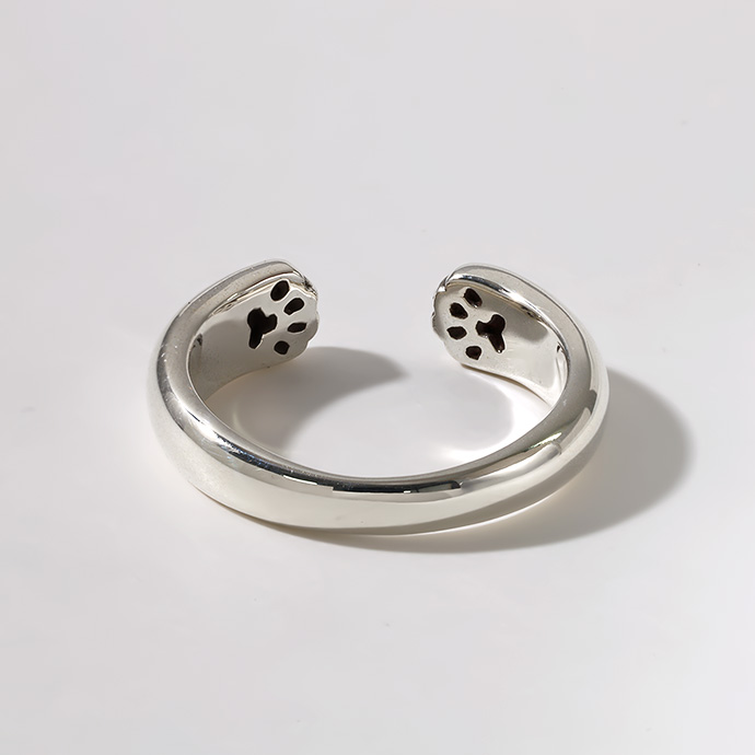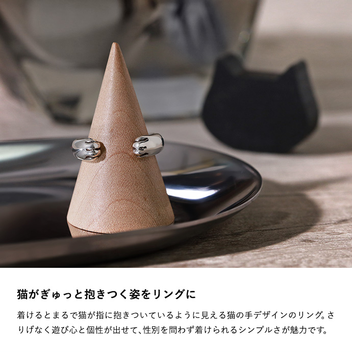 | 説明 | 猫の手を模したデザインのオープンリング。着けるとまるで猫が指に抱きついているように見える遊び心あるデザインです。猫の手のチャームポイントである肉球もリング内側に刻印されています。一見シンプルながらさりげなく個性も出せる、猫好きにオススメのアイテムです。 | |