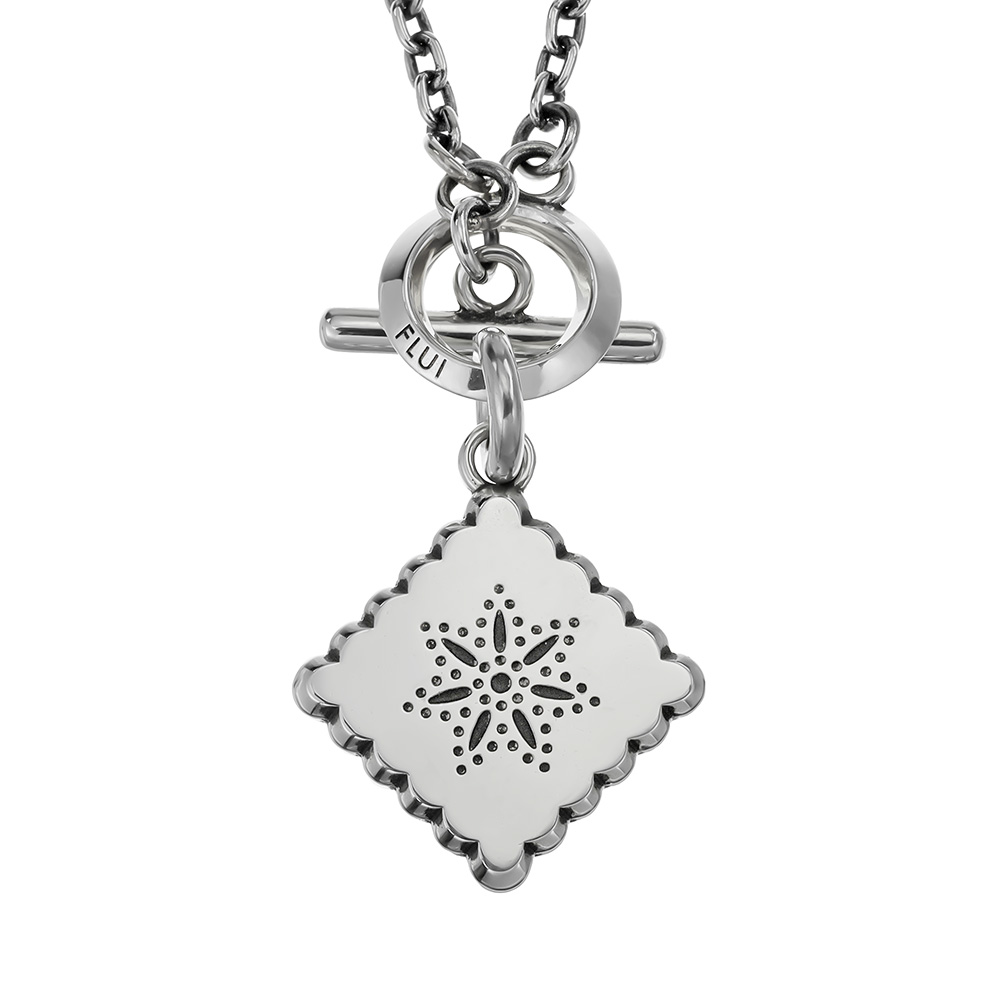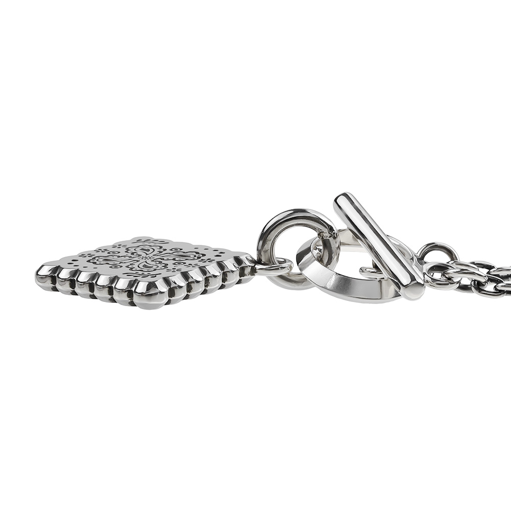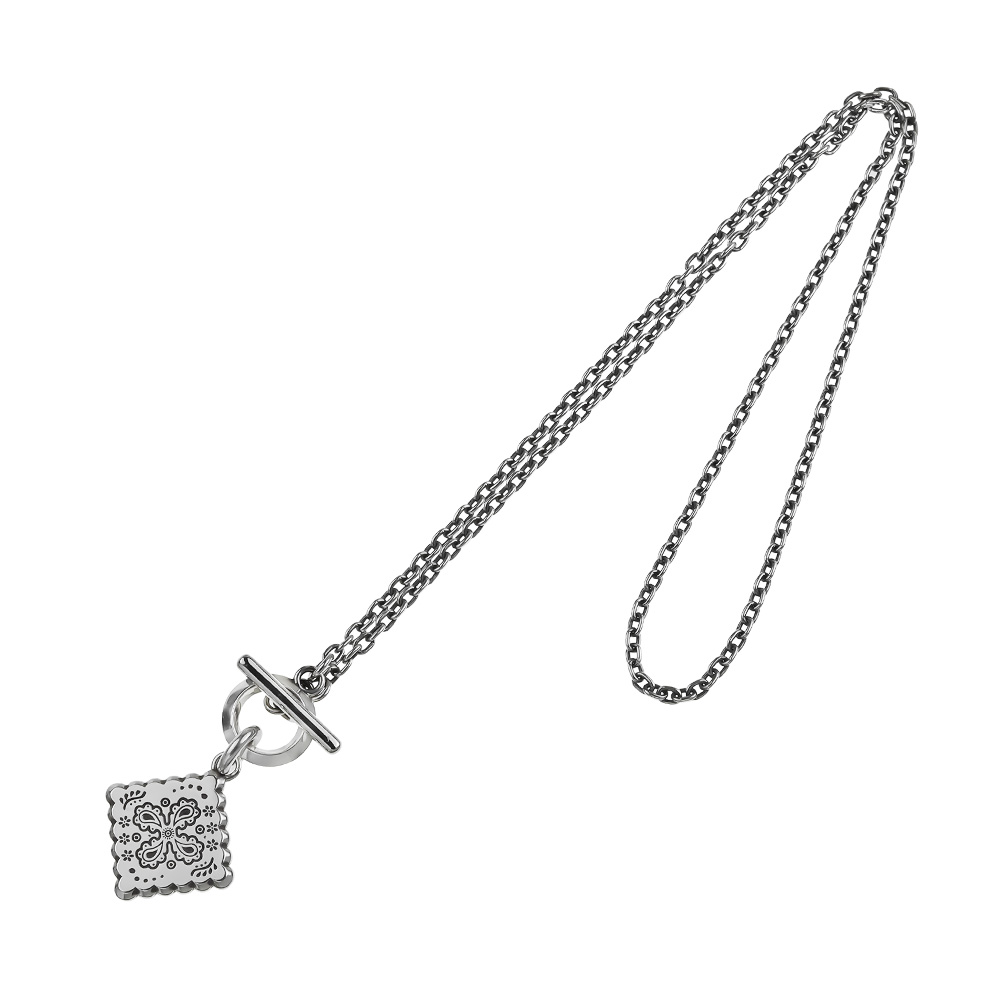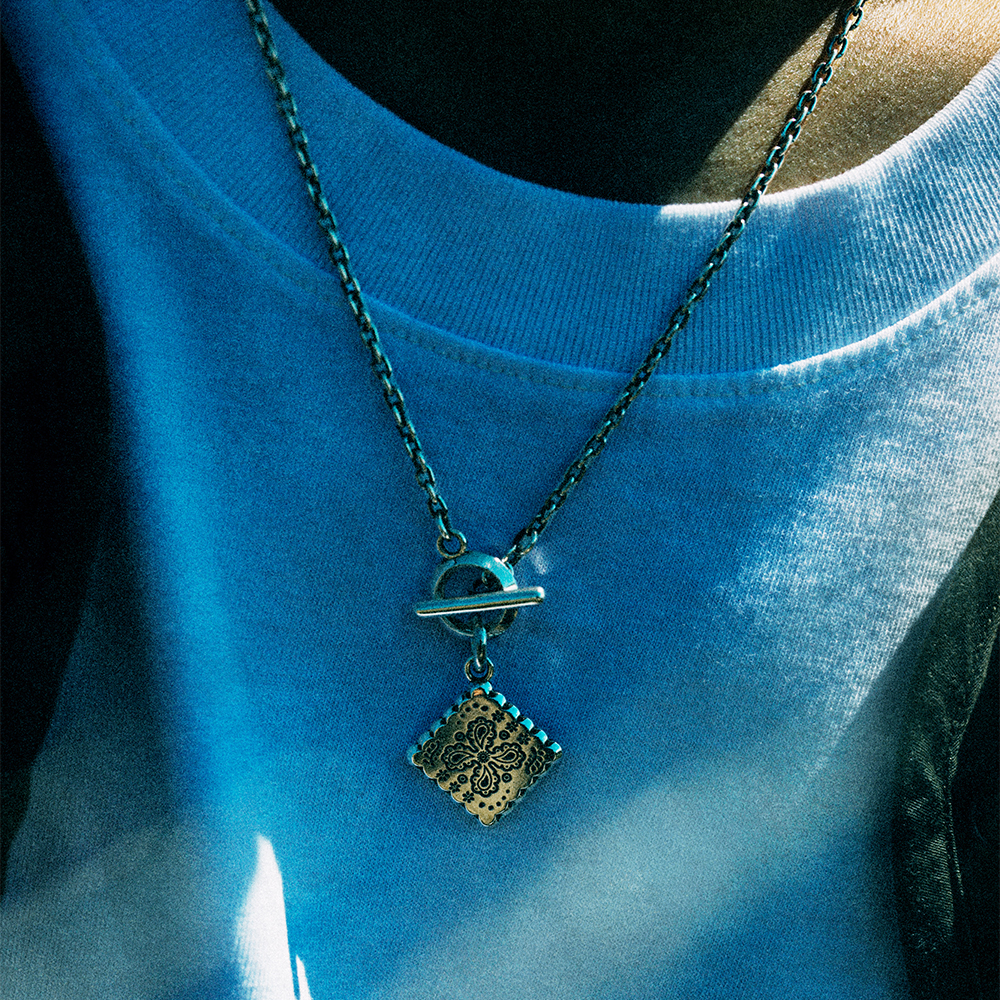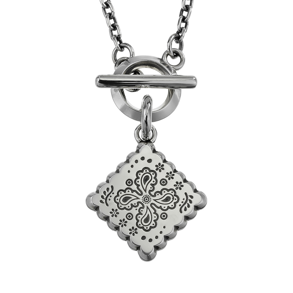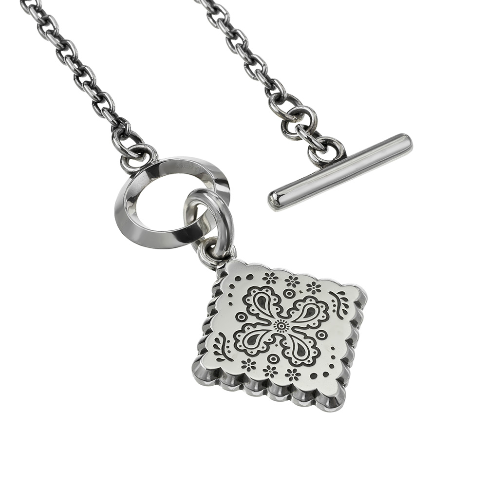 ヴィンテージバンダナの中でもコアな人気を誇るクッキー柄。そのモチーフであるペイズリーや草花を緻密に彫刻したペンダントネックレスです。デニムジャケットの襟元から覗くバンダナをイメージに、ペイズリーやバンダナの持つ「流れ」をシルバーアクセサリーに昇華しています。シンプルに仕上げたマンテルとTバー、そして燻し加工を施したチェーンが全体の印象を引き締め、スタイリングに自然と溶け込みながらも確かな存在感を示します。職人の手仕事により仕上げられた、しっかりとした厚みと重みが着ける満足感をもたらす大人のためのネックレスです。 [FLUI NEW PAISLEY COLLECTION LINEUP|RIVULET] FLUIによるペイズリーコレクションの新ライン・「RIVULET(リヴュレット)」。ペイズリーの有機的な曲線や生命感を、職人の手による繊細な彫刻と磨きで表現。「線と面」「光と影」など、すべてのディテールに「RIVULET(小さな流れ)」の概念が息づいています。 古代ペルシャに起源を持つペイズリーはバンダナ柄としても浸透し、ジーンズと共にカウンターカルチャーの中で共鳴してきました。ジーンズの聖地・児島から、FLUIはその歴史に敬意を込めて「シルバーにペイズリーを刻む」という新たなクラフトのかたちを提案します。 | |