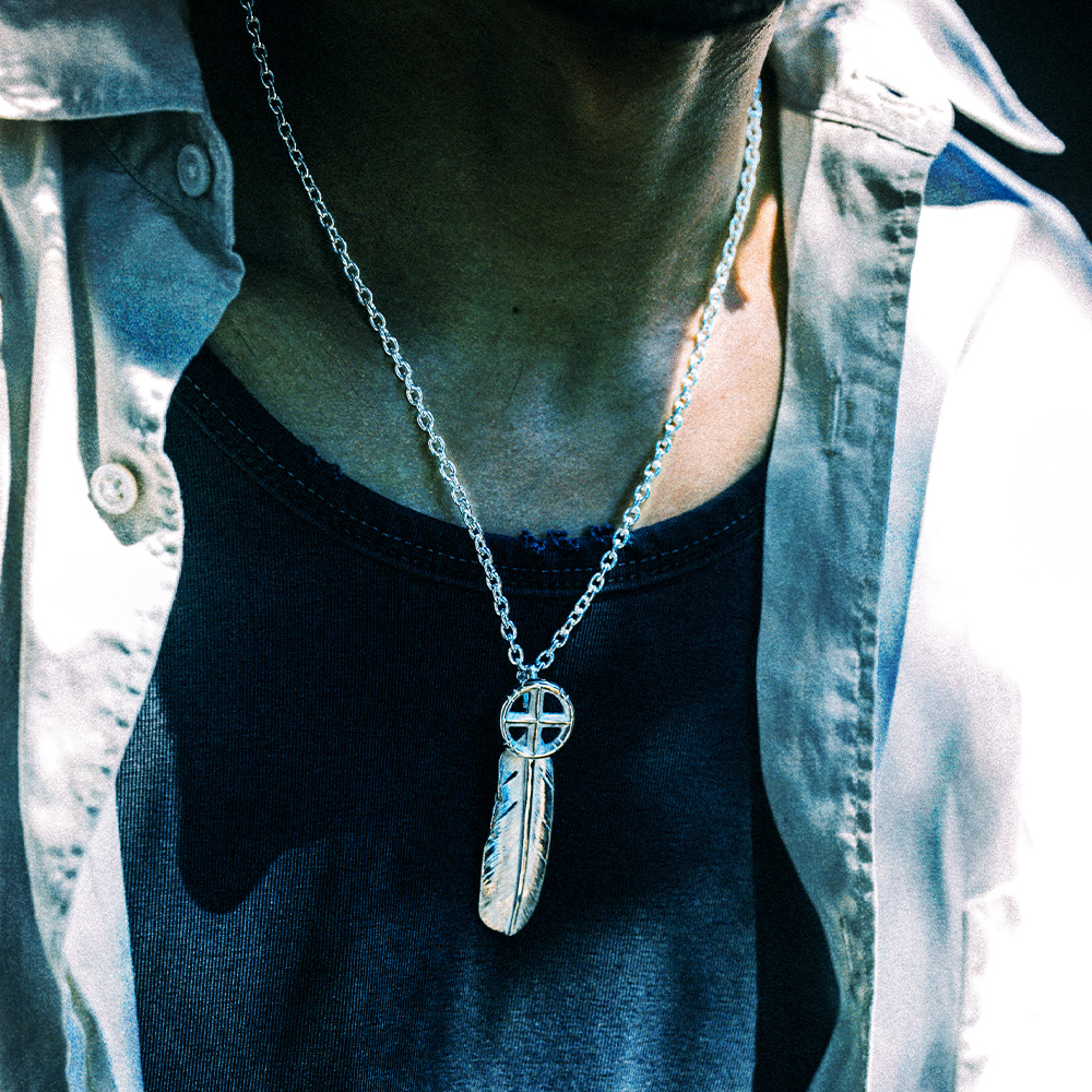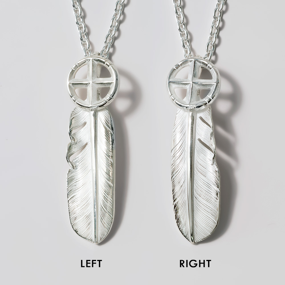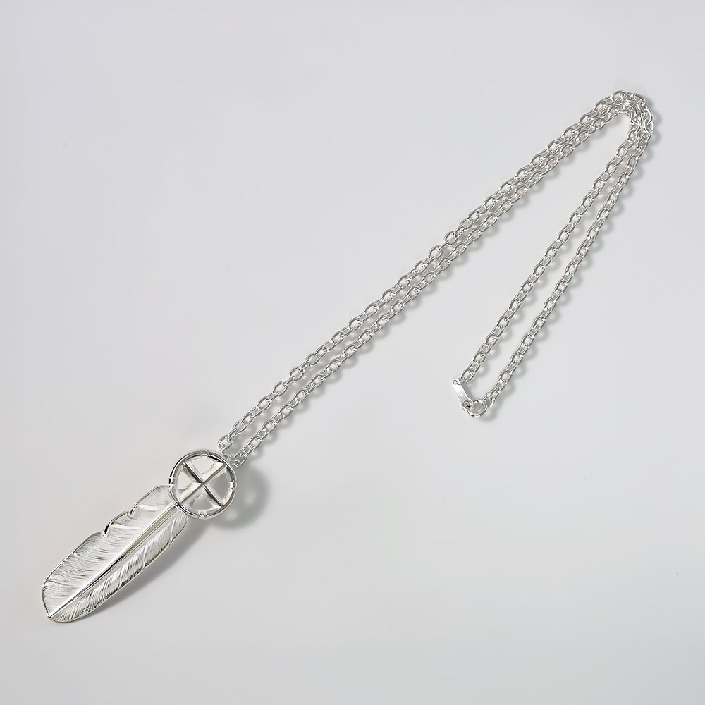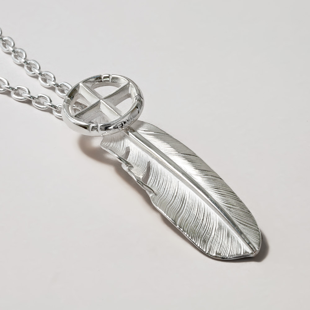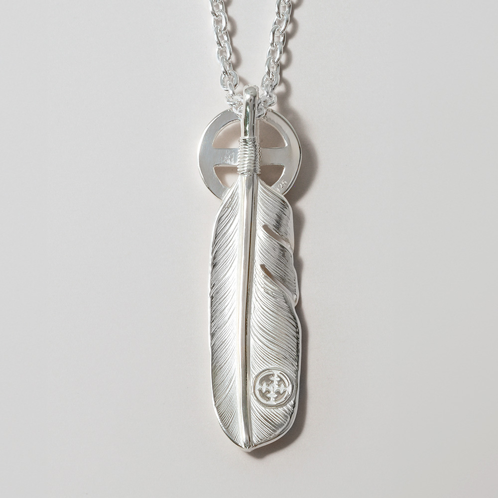 FLUIとサンシャイン工房のコラボレーションペンダント。サンシャイン工房のフェザーを原型に使用したフェザーは、1本ずつ刻まれた極細ラインにより軽やかな羽毛が緻密に表現されている。FLUIのフォーチュンホイールはシンプルながらしっかりとした厚みと存在感のあるデザイン。サンシャイン工房の職人技が光るフェザーとFLUIの立体感あるホイールが織りなす、今までにないフェザーペンダントです。