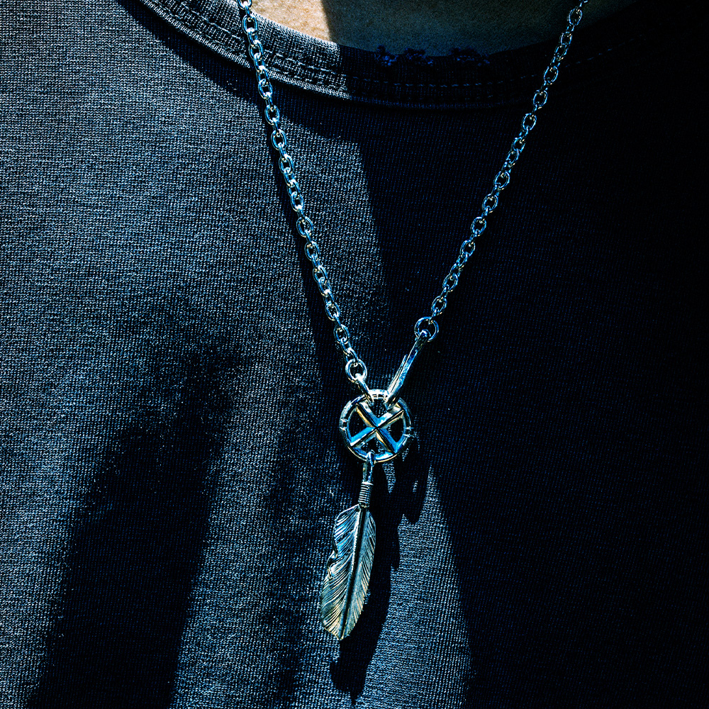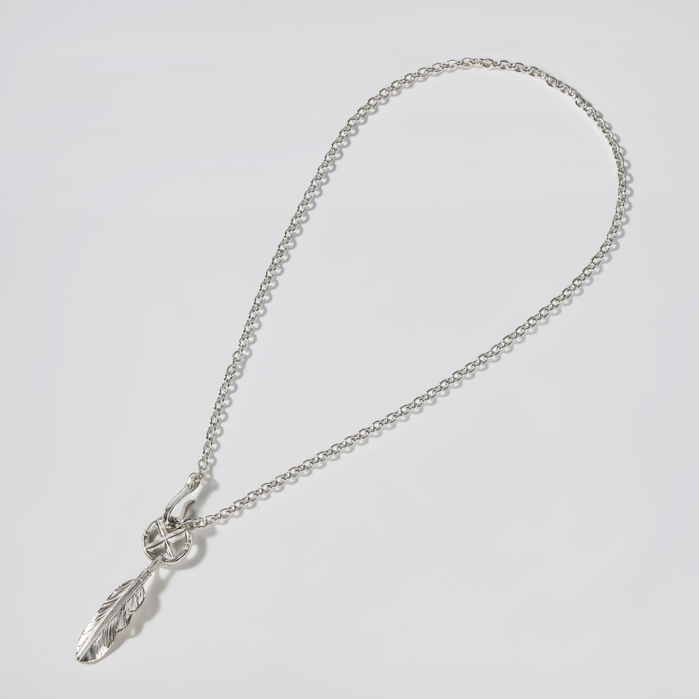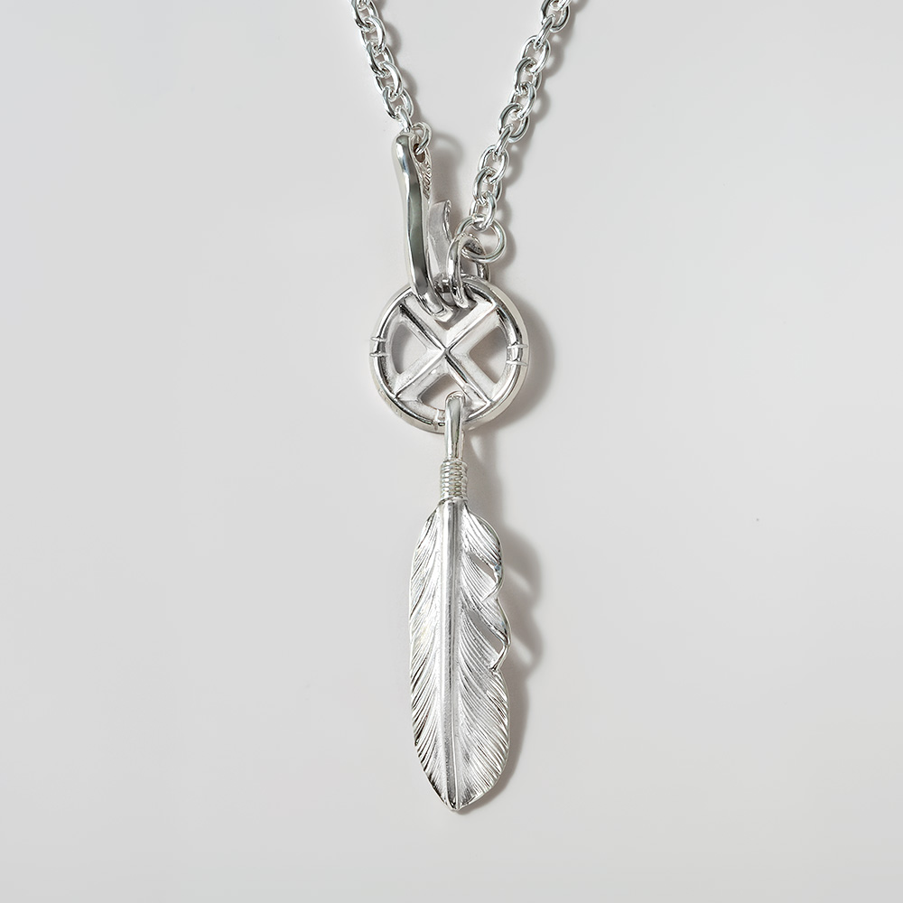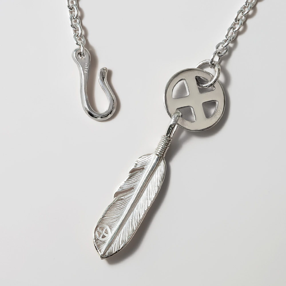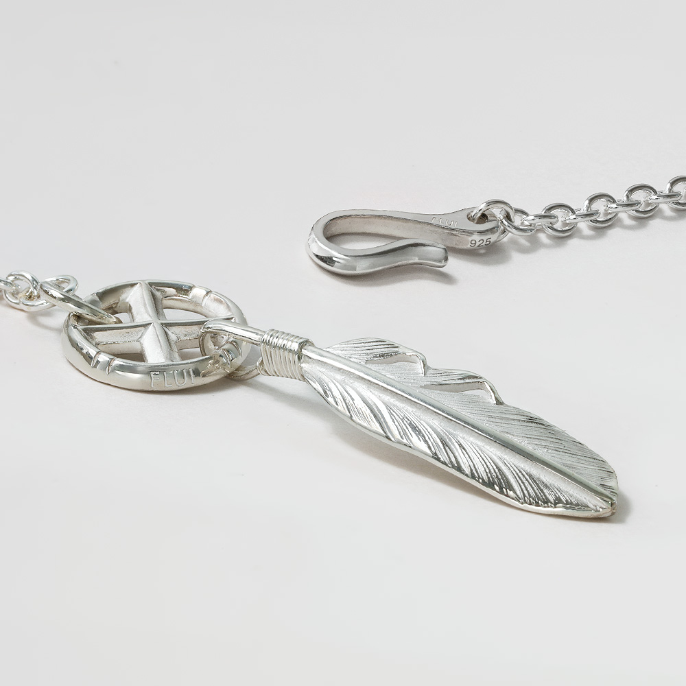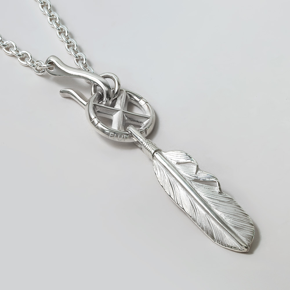 FLUIとサンシャイン工房のコラボレーションネックレス。サンシャイン工房のフェザーを原型に使用したフェザーは、1本ずつ刻まれた極細ラインにより軽やかな羽毛が緻密に表現されている。FLUIのフォーチュンホイールとフックはシンプルながらしっかりとした厚みと存在感のあるデザイン。サンシャイン工房の職人技が光るフェザーとFLUIの立体感あるホイールが織りなす、今までにないフェザーペンダントです。