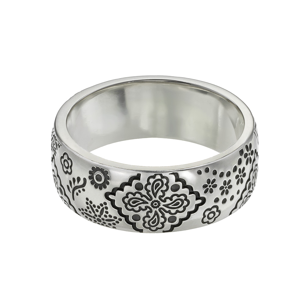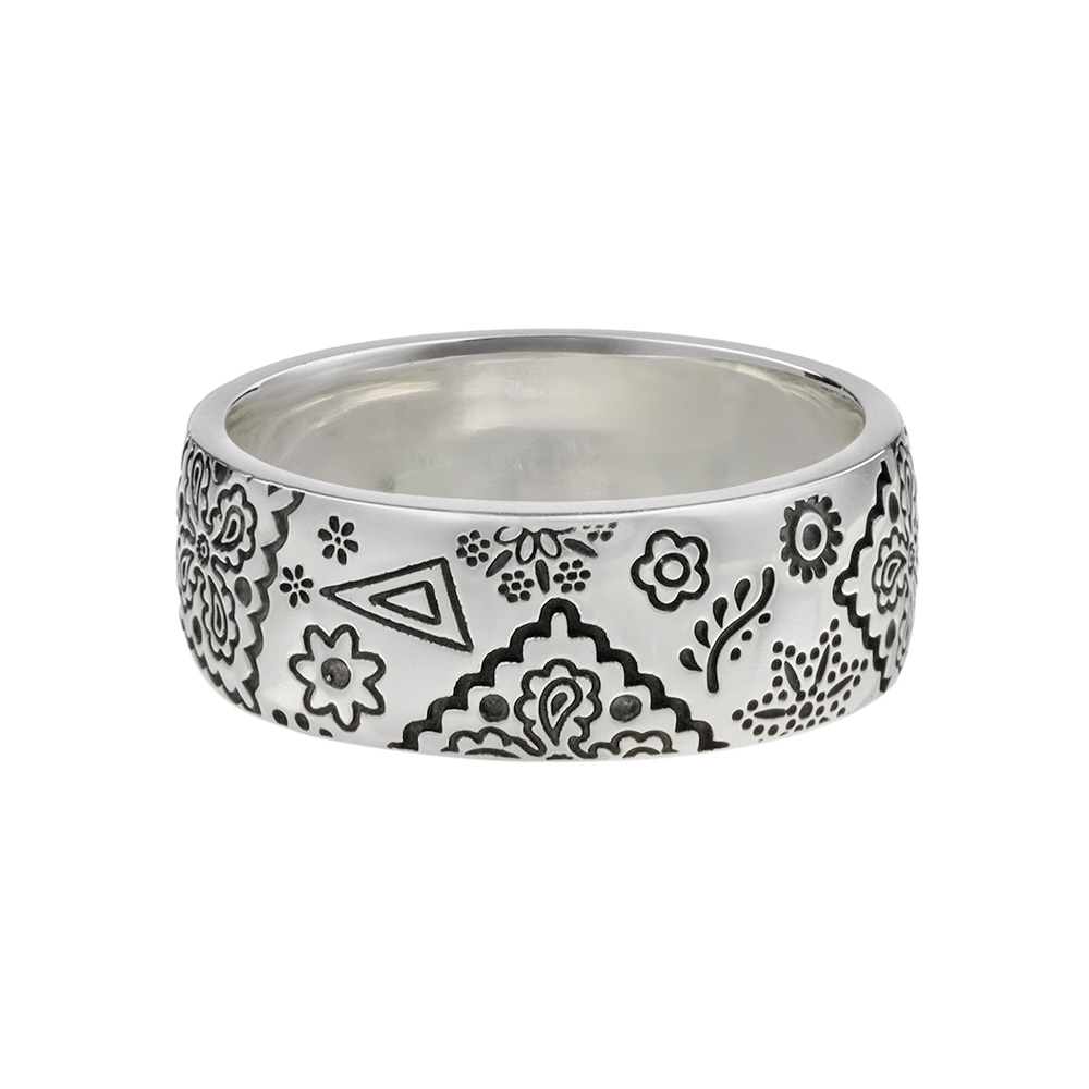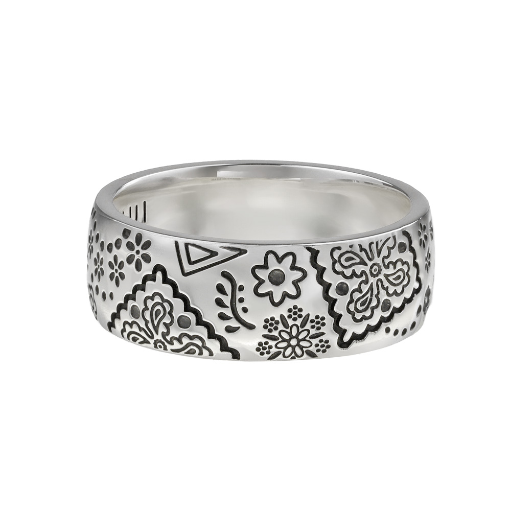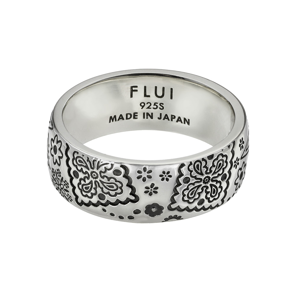 全体にペイズリー模様を散りばめた、遊び心と存在感のある甲丸リング。ヴィンテージバンダナの中でもコアな人気を誇るクッキー柄。その柄の構成要素であるペイズリーや草花を緻密な彫刻で表現しています。リング全体に切れ目なく彫刻されており、リングが回るのを気にせずに着けられる利便性のみならず、芸術性の高さを感じさせます。シルバー925特有の重厚感と指に自然と馴染む装着感が魅力。職人の手仕事により丁寧に磨かれ、素材の持つ温かみとクラフトマンシップを感じる仕上がりになっています。 [FLUI NEW PAISLEY COLLECTION LINEUP|RIVULET] FLUIによるペイズリーコレクションの新ライン・「RIVULET(リヴュレット)」。ペイズリーの有機的な曲線や生命感を、職人の手による繊細な彫刻と磨きで表現。「線と面」「光と影」など、すべてのディテールに「RIVULET(小さな流れ)」の概念が息づいています。 古代ペルシャに起源を持つペイズリーはバンダナ柄としても浸透し、ジーンズと共にカウンターカルチャーの中で共鳴してきました。ジーンズの聖地・児島から、FLUIはその歴史に敬意を込めて「シルバーにペイズリーを刻む」という新たなクラフトのかたちを提案します。 | |