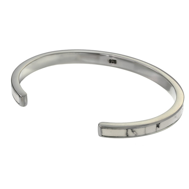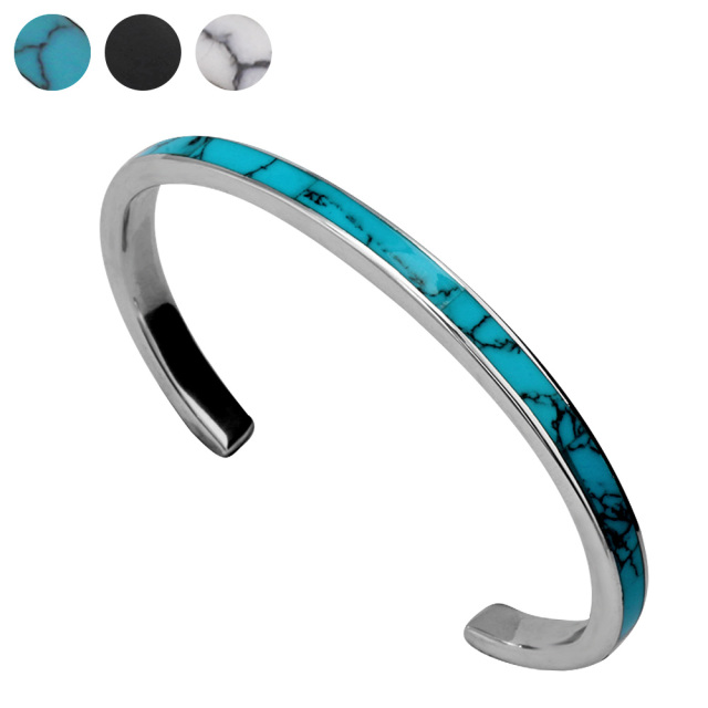 中央に入ったストーンが目を惹くバングルです。ストーンは鮮やかなカラーが人気のターコイズの他、オニキス、ハウライトをご用意。程よい厚みのバングルは、単体での着用はもちろん、レザーブレスレットなどとの重ね付けもオススメです。
