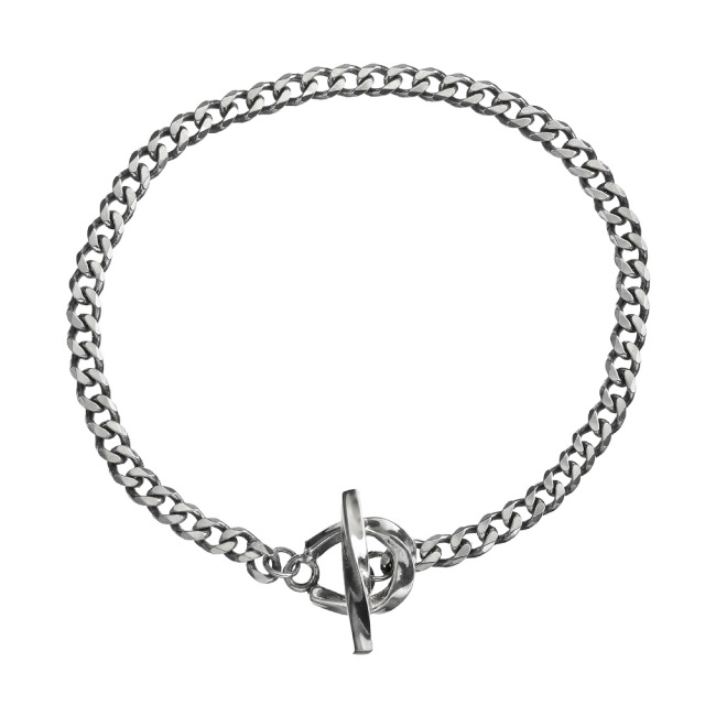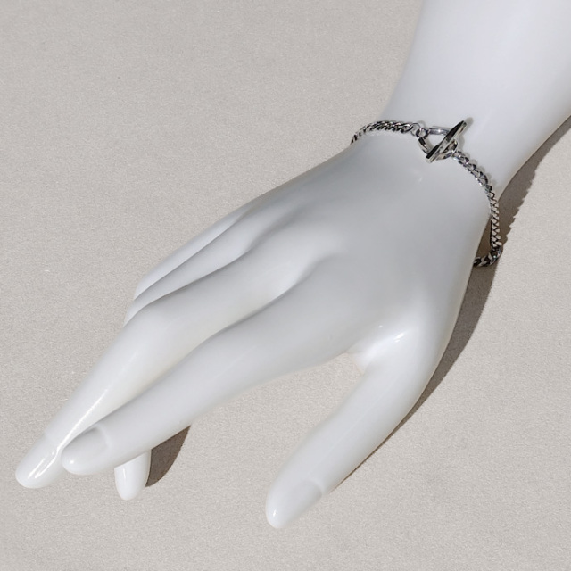 留め具がホースシュー(馬蹄)デザインになった、ユニークなマンテルブレスレットです。チェーン部分はシンプルすぎずギラギラもしすぎない、程よい輝きを実現する6面カット喜平。シルバーの輝きと燻しの黒が存在感とこなれ感を演出するので細めでも様になります。ホースシュー(馬蹄)はラッキーモチーフとして男性女性共に人気。大切な方への贈り物としてオススメしたいアイテムです。