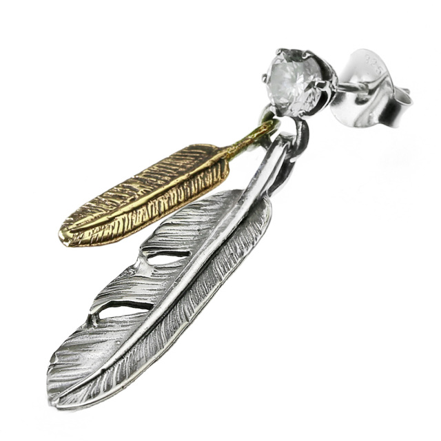 シルバーとゴールドカラーの二枚羽根がモチーフになったピアス。ダイヤモンドのように煌めくジルコニアをあしらい、「動き」と「輝き」で人目を引き寄せるデザインです。飛躍や上昇の象徴として知られる翼や羽根のモチーフは持ち主の秘めた能力を高めてくれると言われており、ジルコニアをアクセントにすることで、このピアスには『自由に躍進し輝き続ける』という意味が込められています。