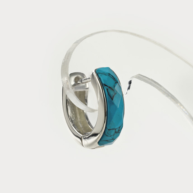 天然石を正面にはめ込んだフープ型のピアス。天然石はオニキスとターコイズの2種類をご用意。多面カットを施した天然石は見る角度や光の当たり具合によって様々な表情が現われます。キャッチ部分がスマートになり、きれいなシルエットに仕上がっています。