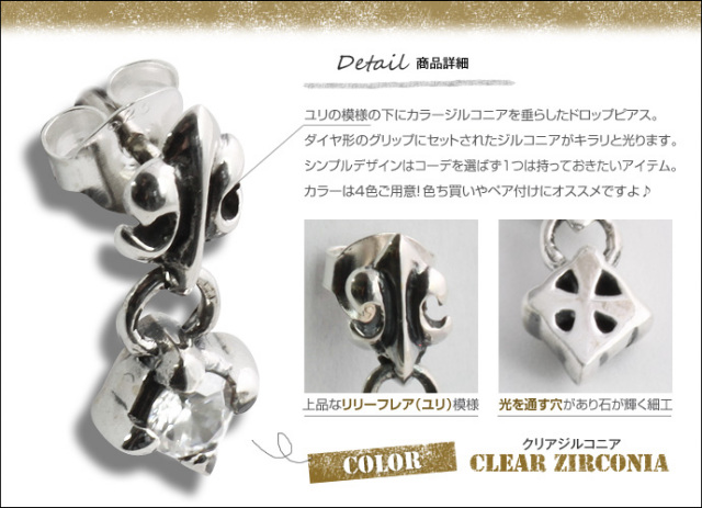 大人気のカラフルジルコニアピアスの新作が登場!ユリの模様の下にカラージルコニアを垂らしたドロップピアス。ダイヤ形のグリップにセットされたジルコニアがキラリと光ります。カラー違いのジルコニアモチーフのピアスは大人気!シンプルデザインはコーデを選ばずひとつは持っておきたいアイテム。ジルコニアのカラーは4色ご用意!色ち買いやペア付けにオススメですよ♪