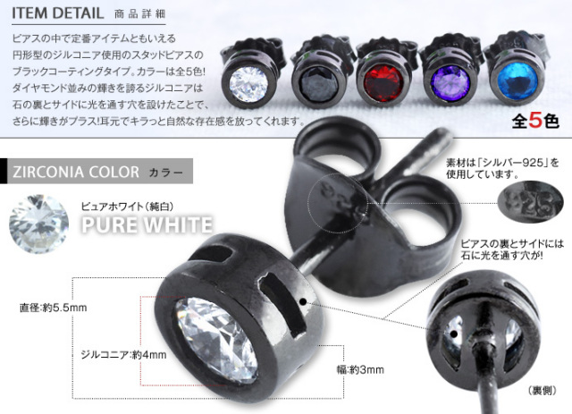 ピアスの中で定番アイテムといえる円形型のジルコニアを使用したスタッドピアスのブラックコーティングタイプです!カラフルなジルコニアは全5色!ダイヤモンド並みの輝きを誇るジルコニアは石の裏とサイドに光を通す穴を設けたことで、さらに輝きがプラス!耳元でキラっと自然な存在感を放ってくれます。値段も手頃なので色チ買い必須!?ペアにもオススメです♪
