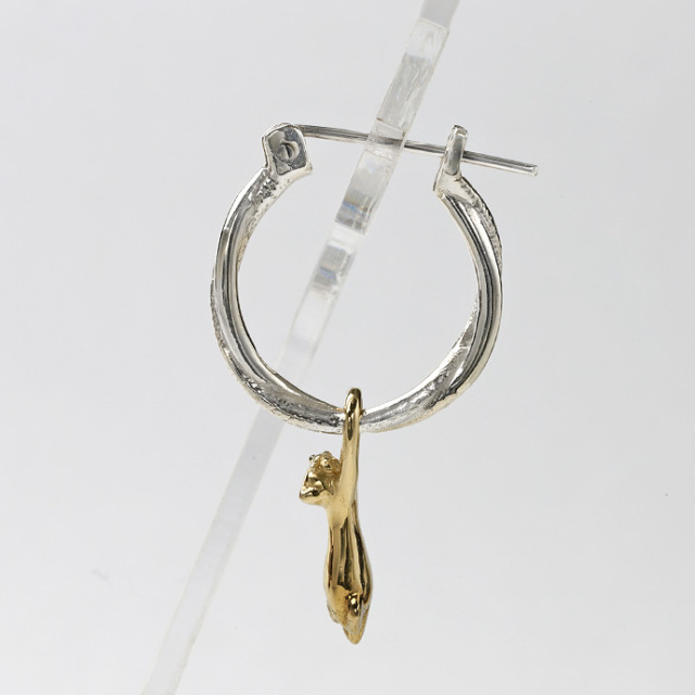 揺れ動く猫チャームが付いたフープピアス。猫がピアスから落ちないようにしがみつく姿がユーモラスに表現されています。シルバー925製のフープピアスは鏡面仕上げの線とザラつきのある線をゆるくねじったデザインで、きれいめになりすぎずこなれ感を演出。猫チャームを外すことで普通のフープピアスとしてもご使用いただけます。大きめのフープピアスとゴールドカラーの猫に思わず目を惹かれる、キャットモチーフ好きにはたまらないアイテムです。
