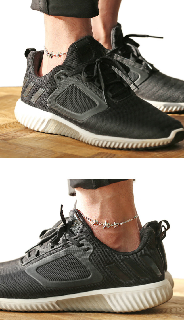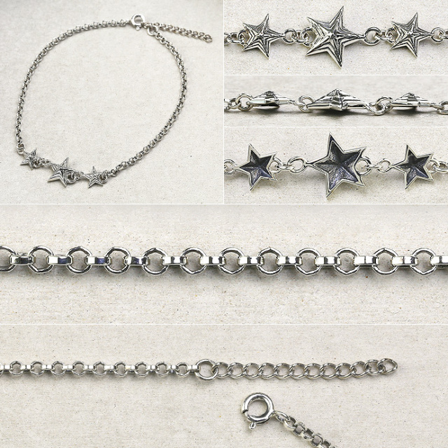 立体感のある星チャームが3つ付いた、チェーンタイプのアンクレットです。チェーンは内側に燻し加工が施されたロールチェーンを使用。引き輪タイプの留め具を使用しており、アジャスターでサイズ調節ができます。単品で着けても存在感は十分、細めなので他のアンクレットとの重ね付けも楽しめます。