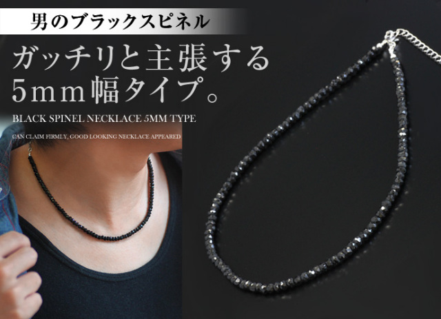 ガッチリと主張したい方にオススメの5mm幅タイプです。サイズはアジャスターにより約40cmから45cmに調節が可能となっています。ブラックスピネルネックレスは黒い天然石の中でも最も艶のあるストーンです。ブラックダイヤモンドに匹敵するといわれるその輝きは美しいの一言。その美しさから多数の芸能人が愛用し、いまや雑誌やテレビで見ない日は無い程の人気ぶりです。