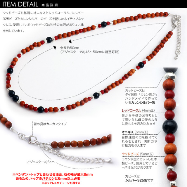 ウッドビーズネイティブ ネックレス オニキス レッドコーラル シルバー カレンシルバー