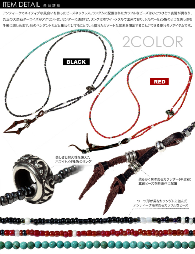 アンティークでネイティブな風合いを持ったビーズネックレス。ランダムに配置されたカラフルなビーズはひとつひとつ表情が異なり、丸玉の天然石ターコイズがアクセントに。センターに通されたリングはホワイトメタルで出来ており、シルバー925製のような美しさを手軽に楽しめます。他のペンダントなどと重ね付けすることで、小慣れたリゾートな印象を演出することができる優れモノアイテムです。