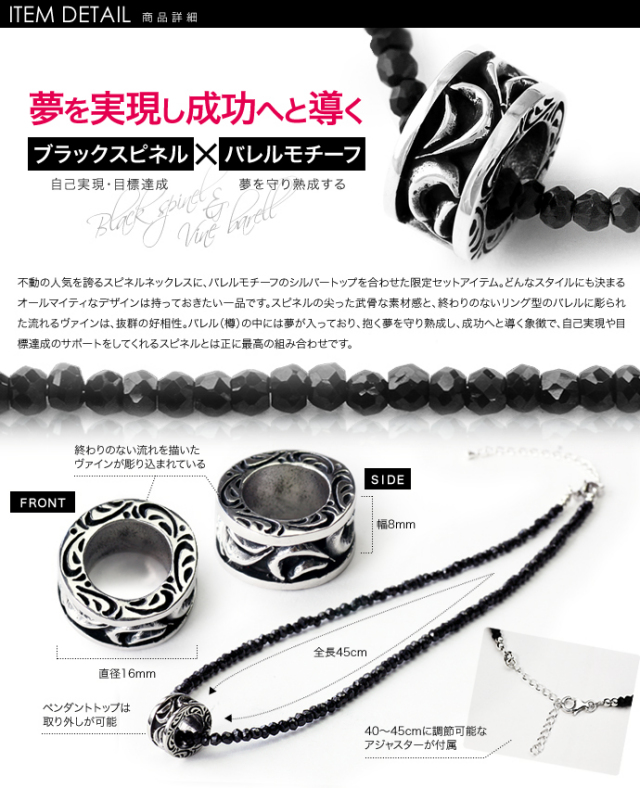 不動の人気を誇るスピネルネックレスに、バレルモチーフのシルバートップを合わせた限定セットアイテム。どんなスタイルにも決まるオールマイティなデザインは持っておきたい一品です。スピネルの尖った武骨な素材感と、終わりのないリング型のバレルに彫られた流れるヴァインは、抜群の好相性。バレル(樽)の中には夢が入っており、抱く夢を守り熟成し、成功へと導く象徴で、自己実現や目標達成のサポートをしてくれるスピネルとは正に最高の組み合わせです。