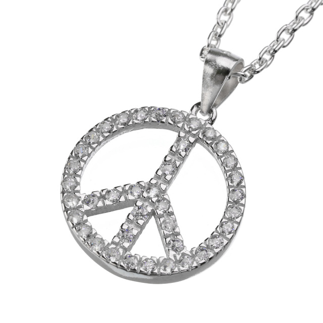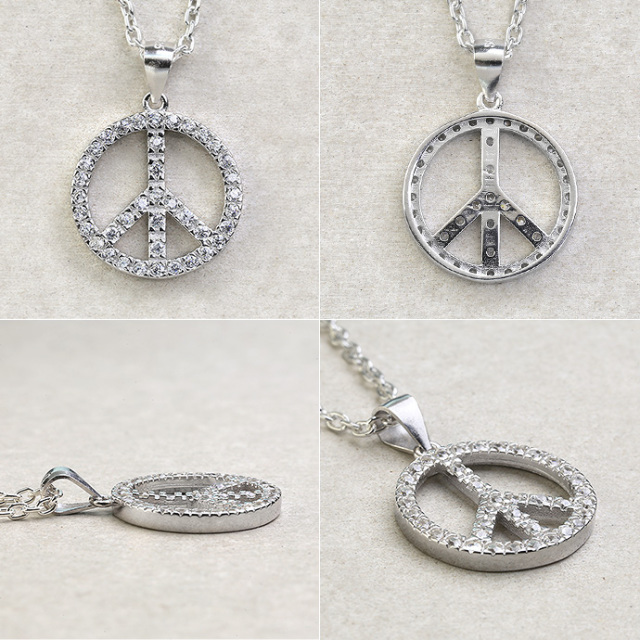ジルコニアを表面にパヴェ状に敷き詰めた、ピースマーク(平和記号)型のペンダント。核軍縮を表すマークが後に平和・反戦のシンボルとして世界中に広がりました。パヴェとは小さな石を隙間なくセットするデザインのことで、豪華な輝きが魅力です。ストリート系やヒップホップ系スタイルにさり気なく取り入れられるアクセです。