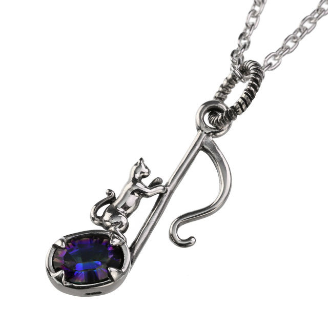 ネコと8分音符を組み合わせたデザインのペンダントです。ミスティッククオーツの輝きがアクセントになっています。ミスティッククォーツとは、水晶にチタンをコーティングし神秘的な“虹色”に加工したものです。角度により様々な色に見えるのが特徴です。