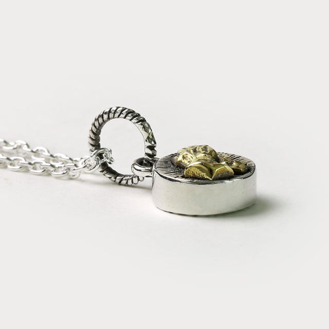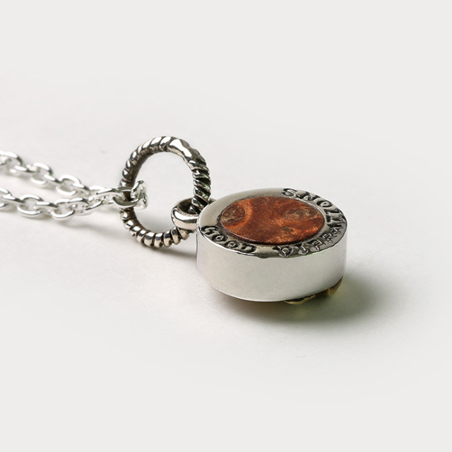 祈りの手をモチーフにした「プレイハンド」をデザインしたペンダント。 プレイハンドはメキシコ系アメリカンの間ではメジャーなデザインとして知られており、「幸運」「愛」「平和」などの意味を込めて使われることも。裏面にはウッド(木)が埋め込まれています。厚みがあり、小さいながらも存在感のあるアイテムです。
