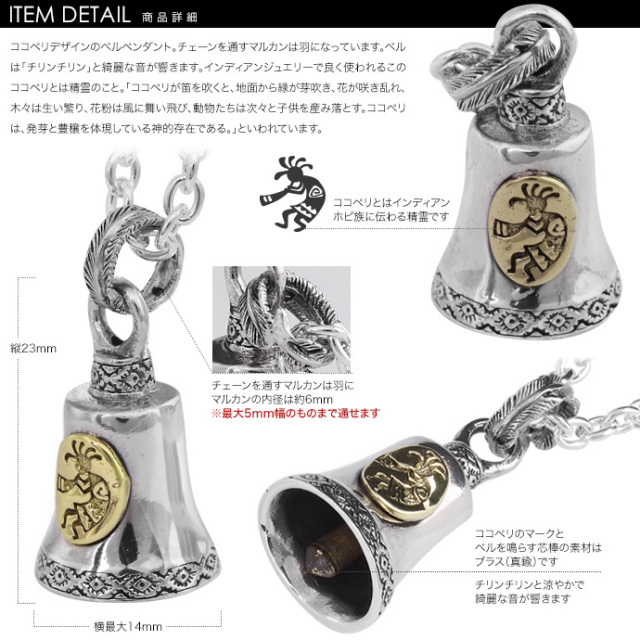 ココペリデザインのベルペンダント! チェーンを通すマルカンは“フェザー(羽)”デザイン! ベルは“チリンチリン”と綺麗な音が響きます。 インディアンジュエリーで良く使われるこのココペリとは精霊のこと。 「ココペリが笛を吹くと、地面から緑が芽吹き、花が咲き乱れ、木々は生い繁り 、花粉は風に舞い飛び、動物たちは次々と子供を産み落とす。 ココペリは、発芽と豊穣を体現している神的存在である。」といわれています。