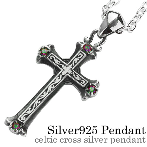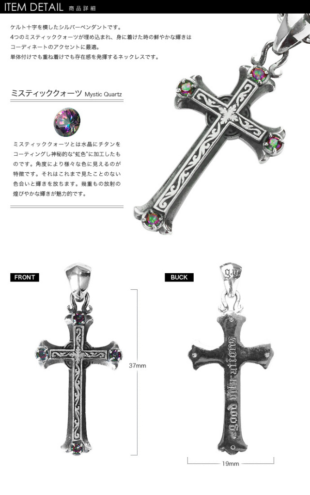 ケルト十字を模したシルバーペンダントトップです。4つのミスティッククォーツが埋め込まれ、身に着けた時の鮮やかな輝きはコーディネートのアクセントに最適。