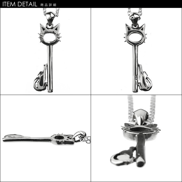 猫のシルエットとキー(鍵)モチーフを組み合わせたペンダントです。猫の耳やヒゲはもちろん、鍵山が伸びをする猫のシルエットになっているなど、随所にこだわりが光ります。
