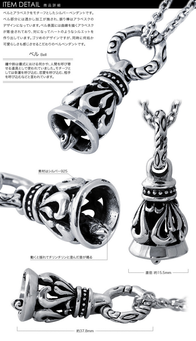 ベルとアラベスクをモチーフとしたシルバーペンダントです。 ベル部分には透かし加工が施され、振り棒はアラベスクのデザインになっています。 ベル表面には曲線を描くアラベスクが彫金されており、対になってハートのようなシルエットを作り出しています。 ゴツめのデザインですが、同時に何処か可愛らしさも感じさせるこだわりのベルペンダントです。