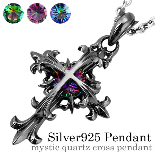 2つのクロスの間に、煌めくミスティッククォーツを中心に挟む形でデザインされたペンダントです。 ミスティッククォーツとは水晶にチタンをコーティングし 神秘的な“虹色”に加工したものです。 ストーンを挟み込む大小のクロスのデザインには、クロス・フローリーとケルト十字を組み合わせており、 重厚な色合いと相まって、胸元で強い存在感を放ちます。 2つのクロスを重ねる事で、他のアクセにはないインパクト大な仕上がりと高貴な雰囲気を両立させています。 中央の石はミスティック、ブルー、グリーンの3種類から選べます。