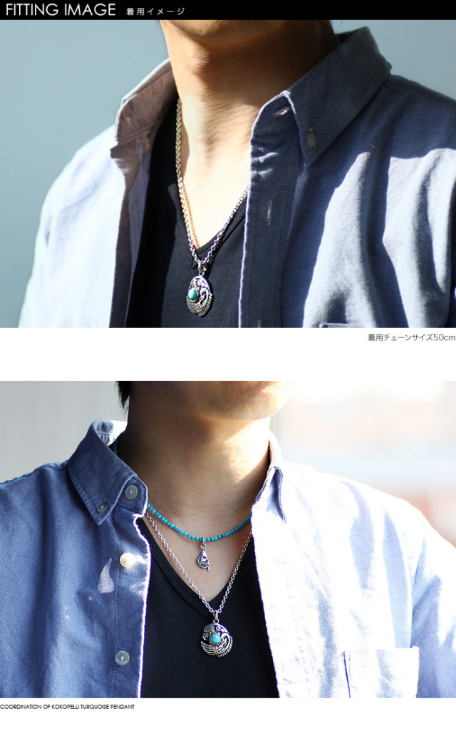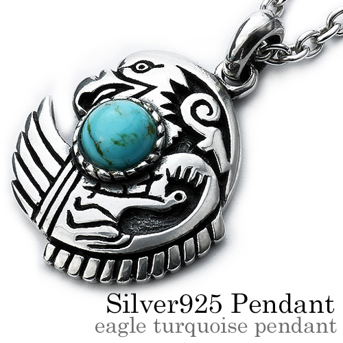 正円の大きなターコイズをイーグルが抱えた目を引くデザイン! イーグルにはネイティブ調の模様が彫り込まれています。 大き目のトップなので少し長めのチェーンを合わせると◎!