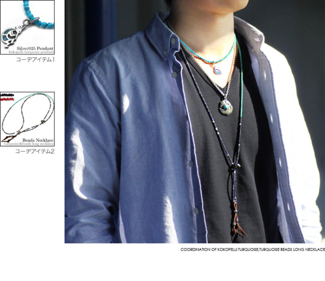 ・ココペリターコイズペンダント・ロングビーズネックレス