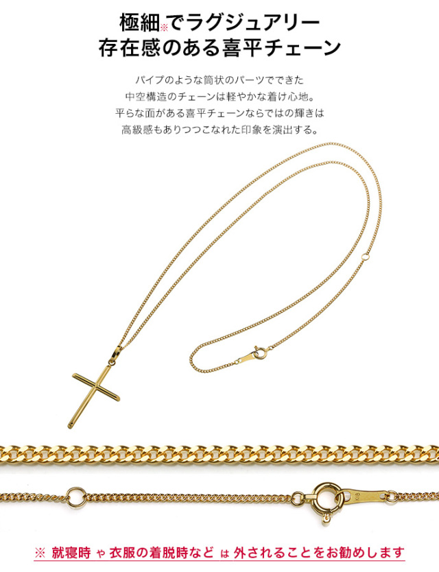 K18ゴールドで作られたクロス(十字架)型ペンダント。曲面から生まれるなめらかな輝きが魅力。側面はななめにカット、立体感を出しながらシャープさも引き出している。クロス・チェーン共に中空構造で着け心地軽やか。 細めでシンプルなデザインに宿る高級感ある輝きが、いつもの服装をワンランク上に演出してくれる。