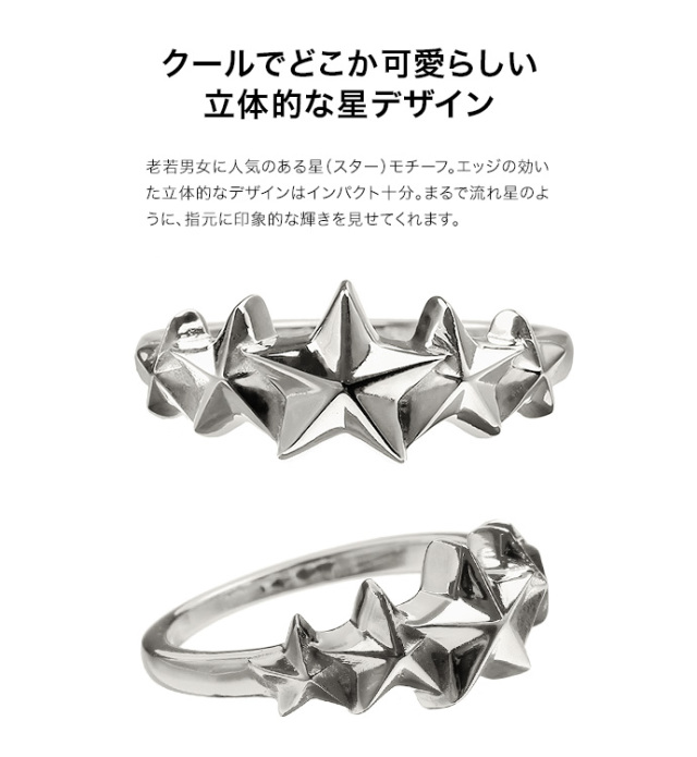 中央から大小グラデーションに並んだ星のモチーフが目を引くリングです。ひとつひとつのモチーフがシンプルながらも立体的でエッジが効いています。リング部はスッキリと細めな作りになっているので、サラッとした着け心地です。