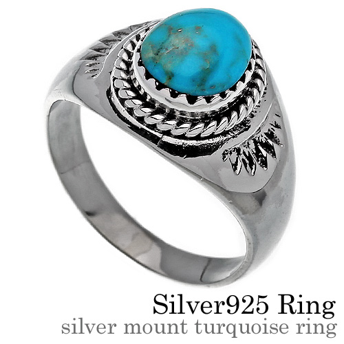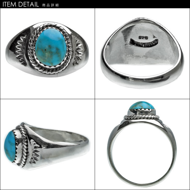 ターコイズ周りに彫金された縄目模様がシンプルながら石の存在感を際立たせます。