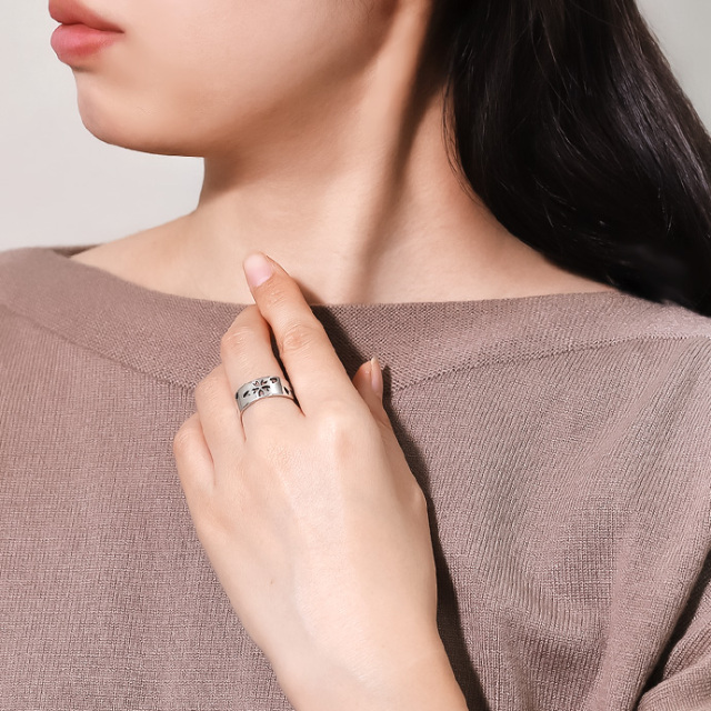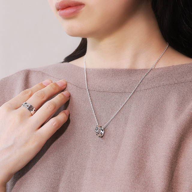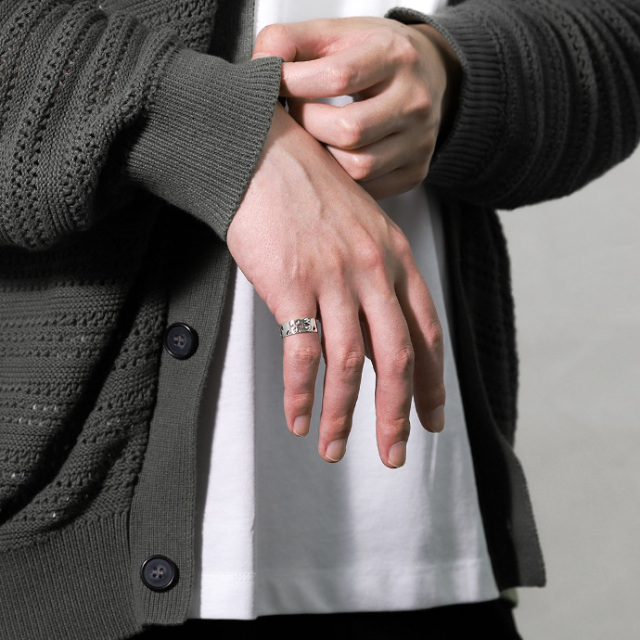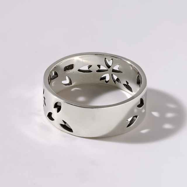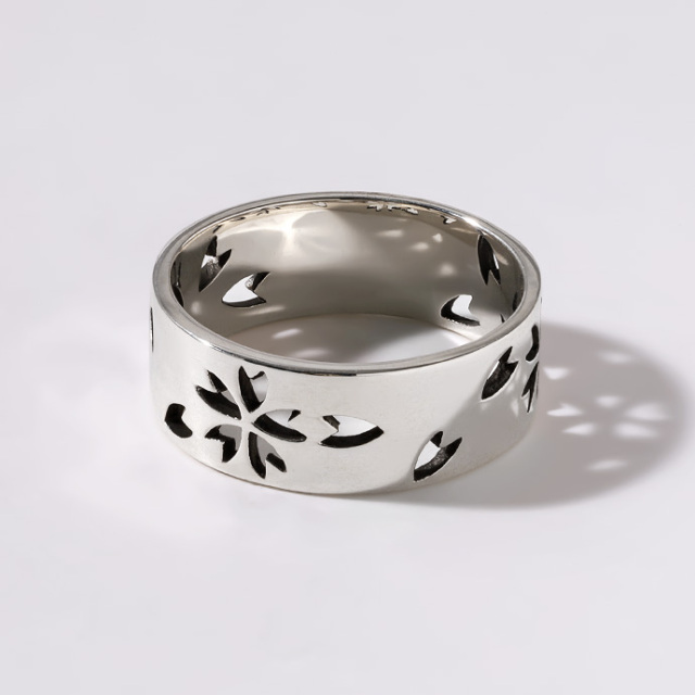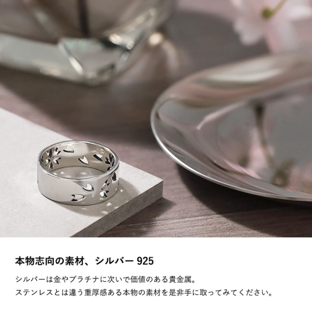 和柄として人気の日本人の魂・桜を、鏡面仕上げの平打ちリングにデザイン。透かし部分のみに入った燻し加工の黒が角度によって見え隠れするので、キレイめすぎず主張もしすぎないのが魅力です。幅広ながら抜け感も演出できる男性も女性も着けやすい桜アイテムです。