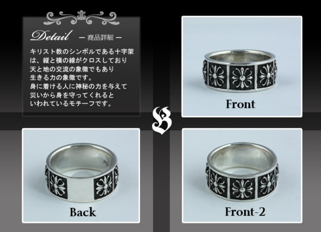 シルバーアクセサリー定番の十字架を羅列したベーシックなリング! キリスト教のシンボルである十字架は、縦と横の線がクロスしており、天と地の交流の象徴であり、生きる力の象徴です。 身に着ける人に神秘の力を与え、災いから身を守ってくれるといわれているモチーフです。 クロスのリングは、ハードなファッションをイメージしますが、 ごつめの存在感のあるリングなので、シンプルなファッションにも合わせて頂いてもカッコイイですよ!!