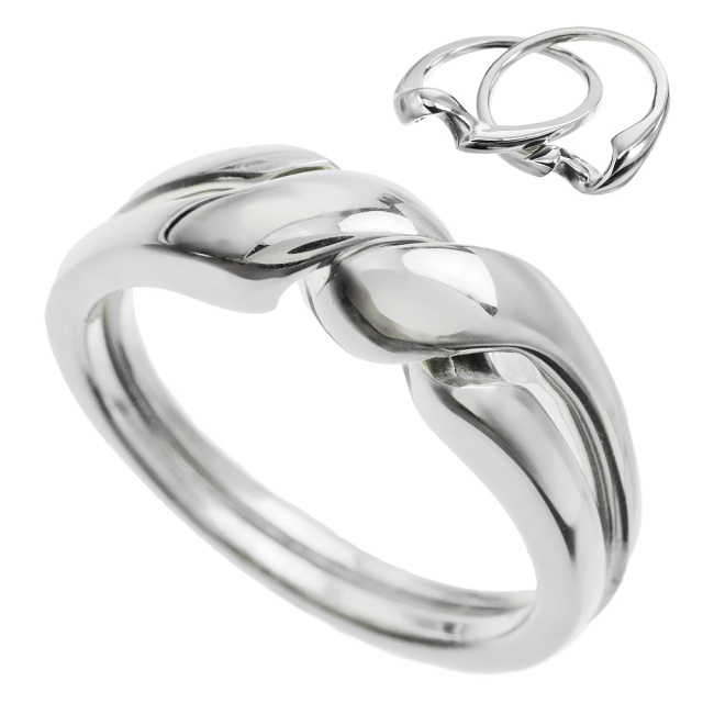 繋がった2つのリングを組み合わせた状態で着ける、パズルリングと呼ばれるタイプのリングです。パズルリングの始まりは15世紀のトルコ、指から外すとバラバラになり中々戻せなかったため、指輪を外して浮気をさせない浮気防止策として、また浮気しないで欲しいという願いを込めて愛する人に贈られました。こちらはバラバラになっても簡単に戻せるため、ファッションアイテムとしてお楽しみ下さい。メッセージリングとしてだけではなく、デザインの良さだけでも十分楽しめるアイテムです。