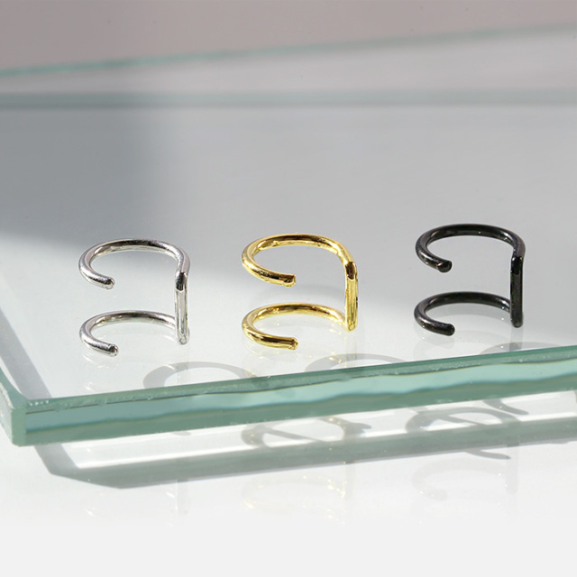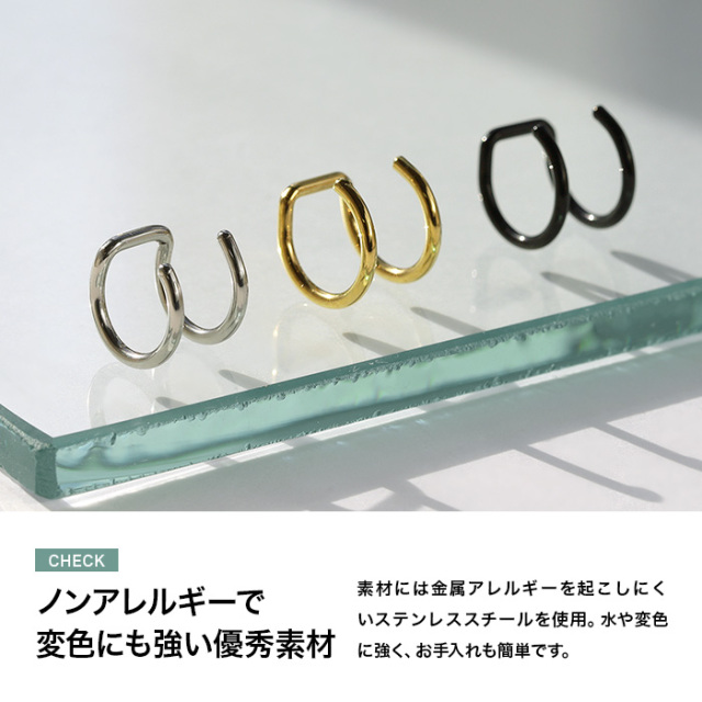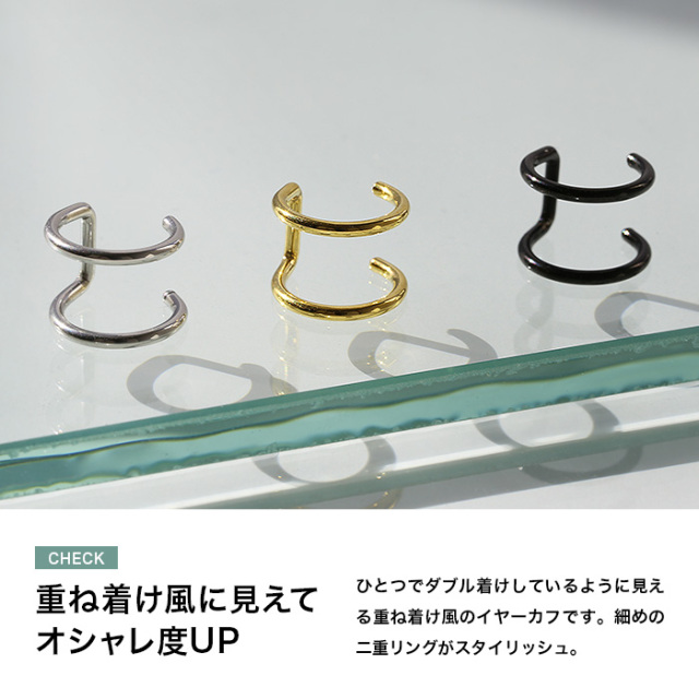 ひとつでダブル着けしているように見える重ね着け風のイヤーカフです。細めの二重リングがスタイリッシュなスタイリングにしてくれます。