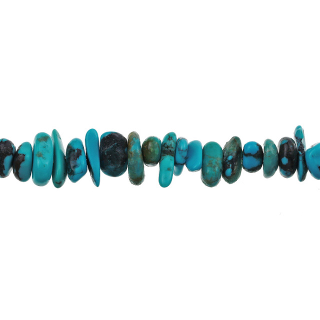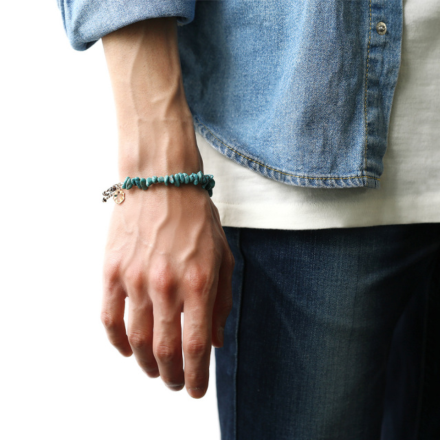 天然のターコイズを使用している為大きさやカラーが一つ一つ違います。そこがまた一層雰囲気が良くナチュラルなテイストを出しています。ジョイント部にはシルバー925に燻し加工を施しアンティーク感を出しています。
