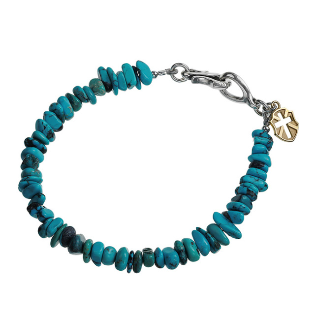 ターコイズブルーのブレスレットはコーディネートのワンポイントになってくれるインパクトのあるカラーです。そのため細めの