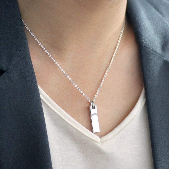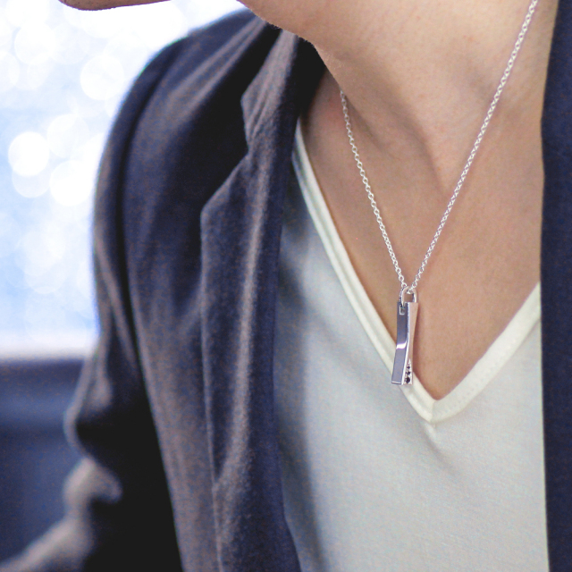 表面の滑らかな湾曲が特徴的で全体的にシャープな印象を受けるフォルムのペンダントトップです。片方の側面にブラックダイヤモンドが3つセットされた、大人が楽しめるラグジュアリーなアクセサリーです。