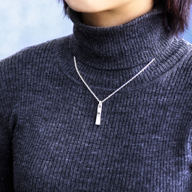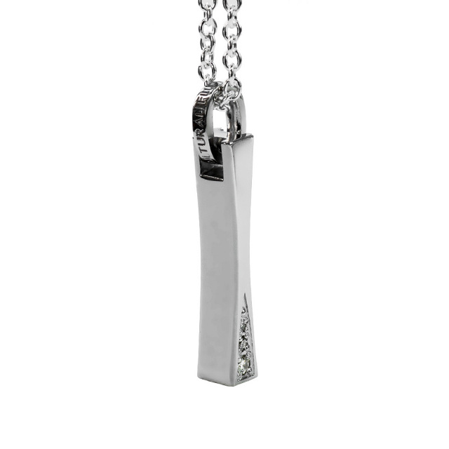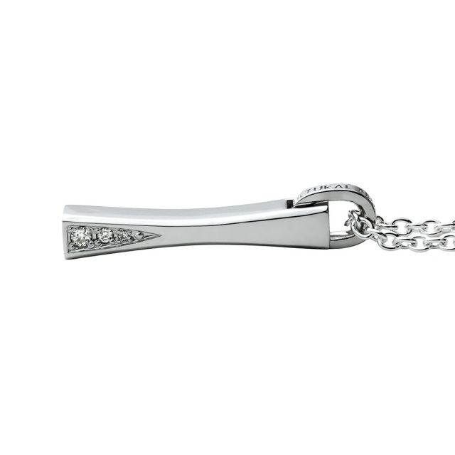表面の滑らかな湾曲が特徴的で全体的にシャープな印象を受けるフォルムのペンダントトップです。片方の側面にダイヤモンドが3つセットされた、大人の女性が楽しめるラグジュアリーなアクセサリーです。